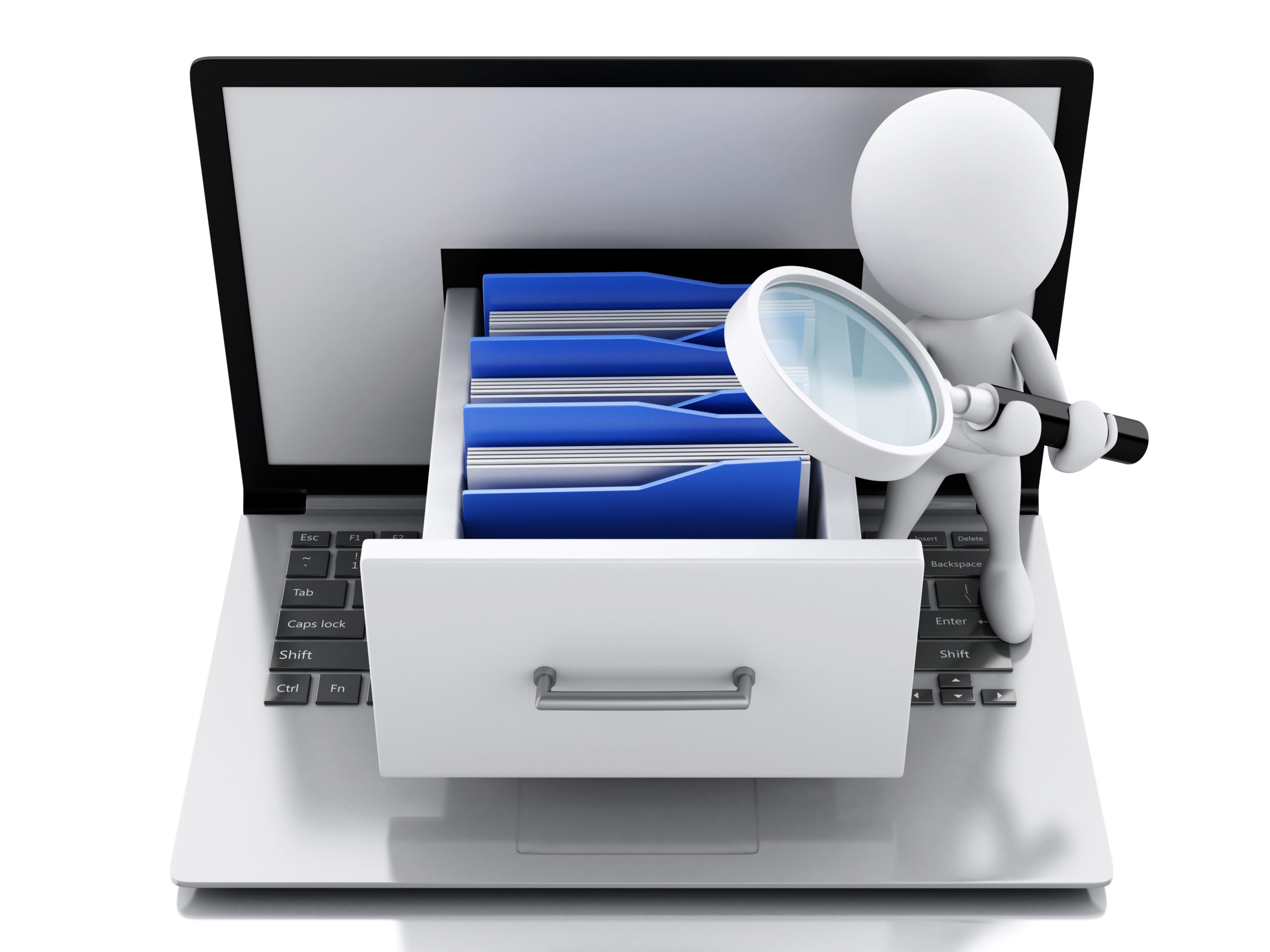 3d white people with Laptop and folders. ← Previous Next → 3d renderer. White people examines files with Laptop and folders. Data storage concept.