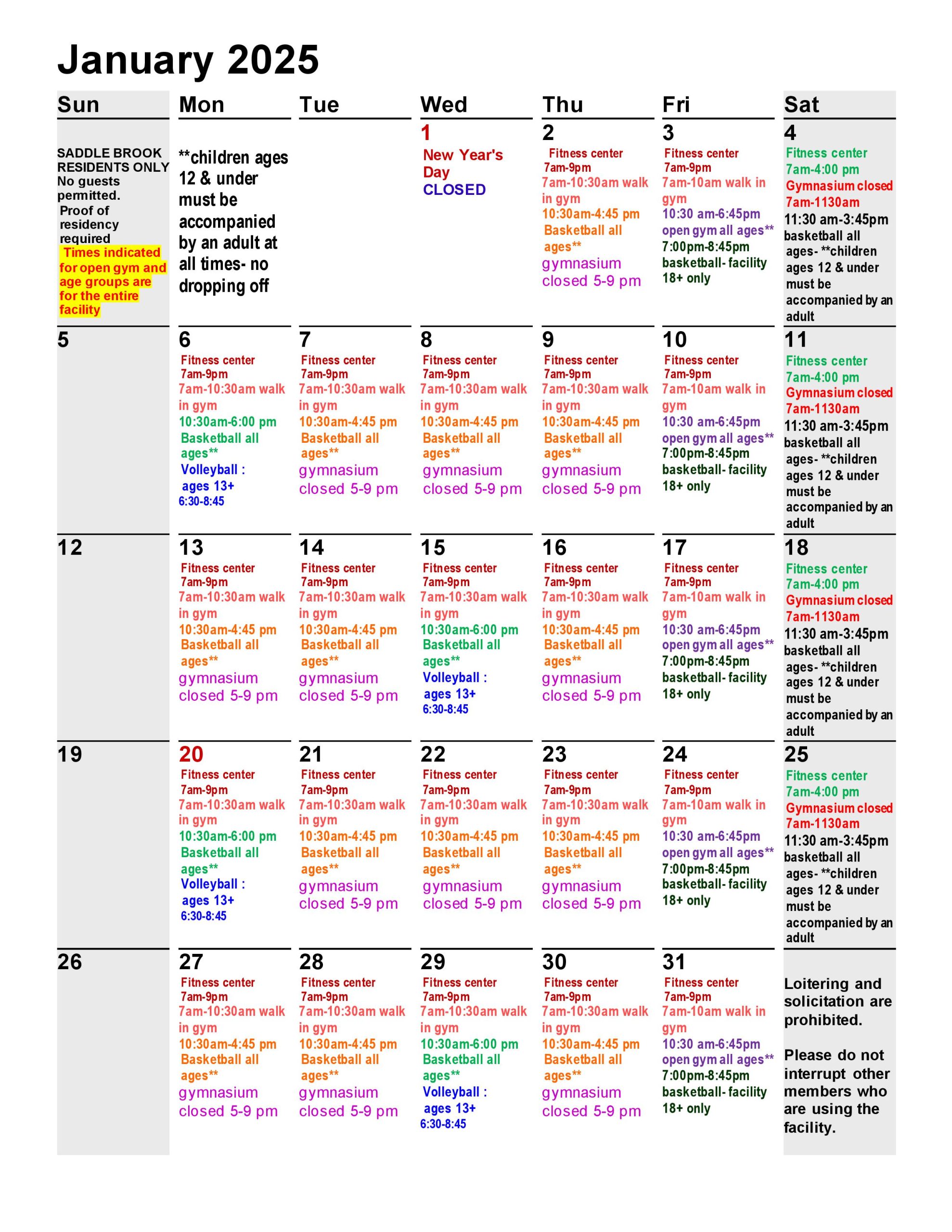 January 2025 Recreation Department Calendar