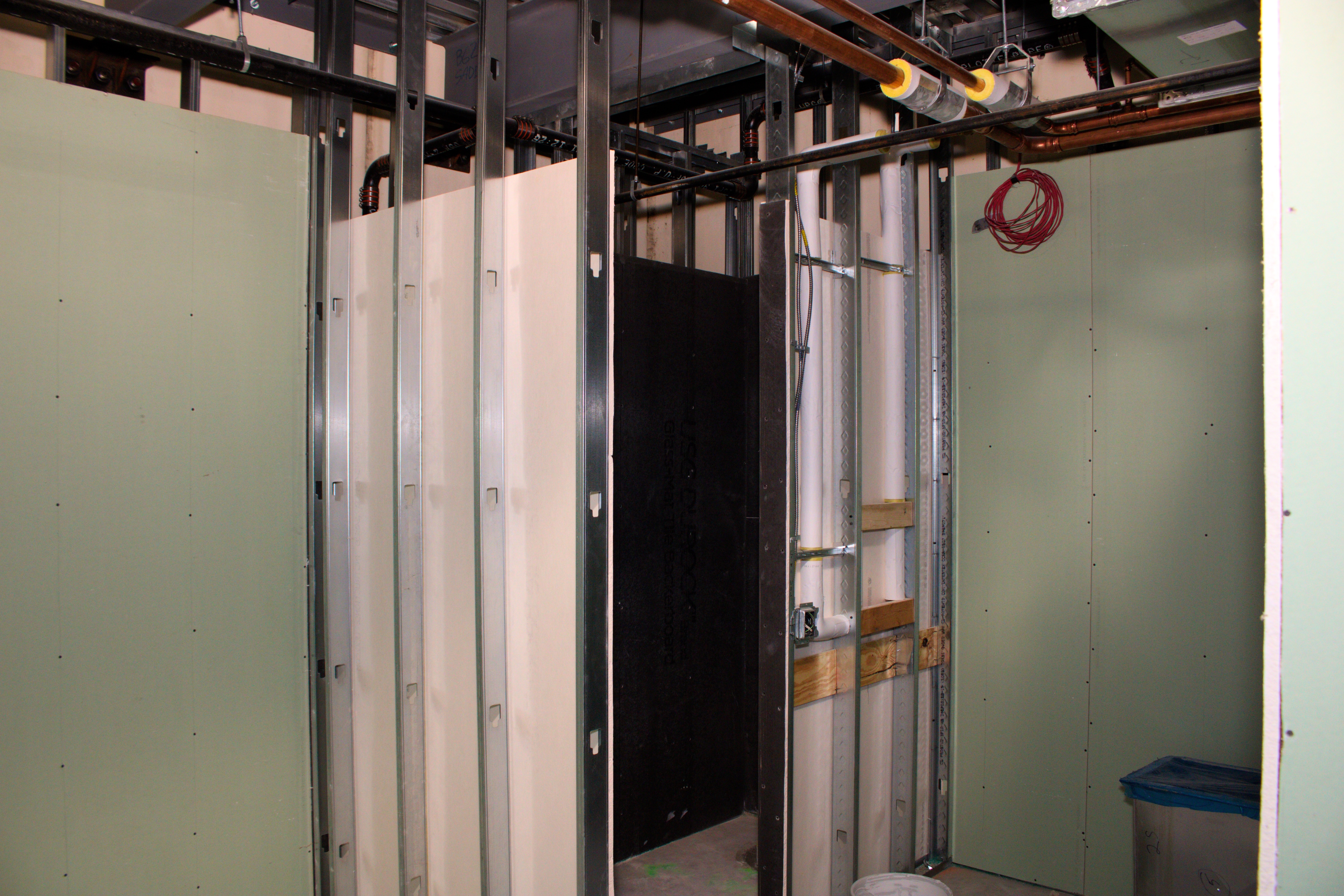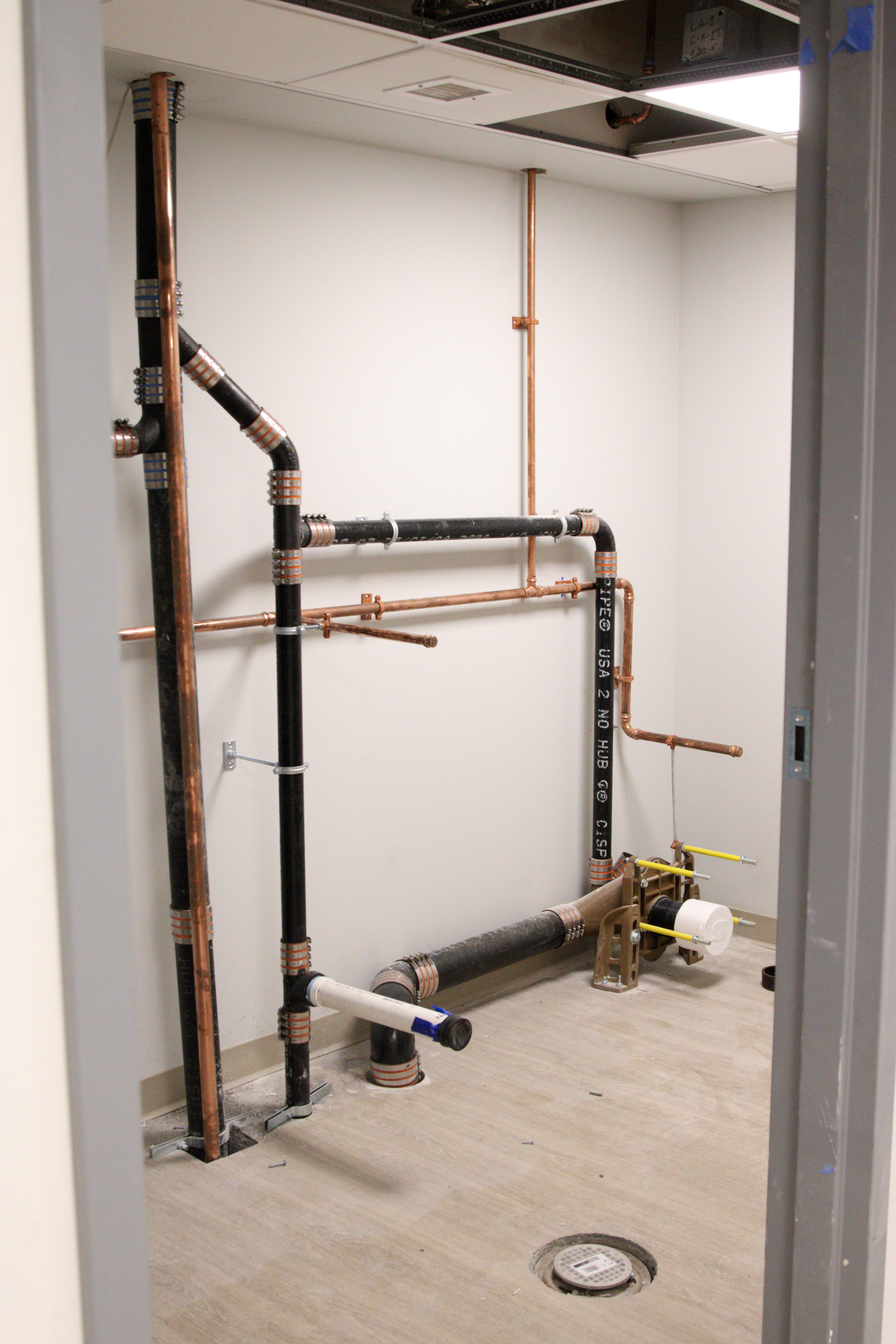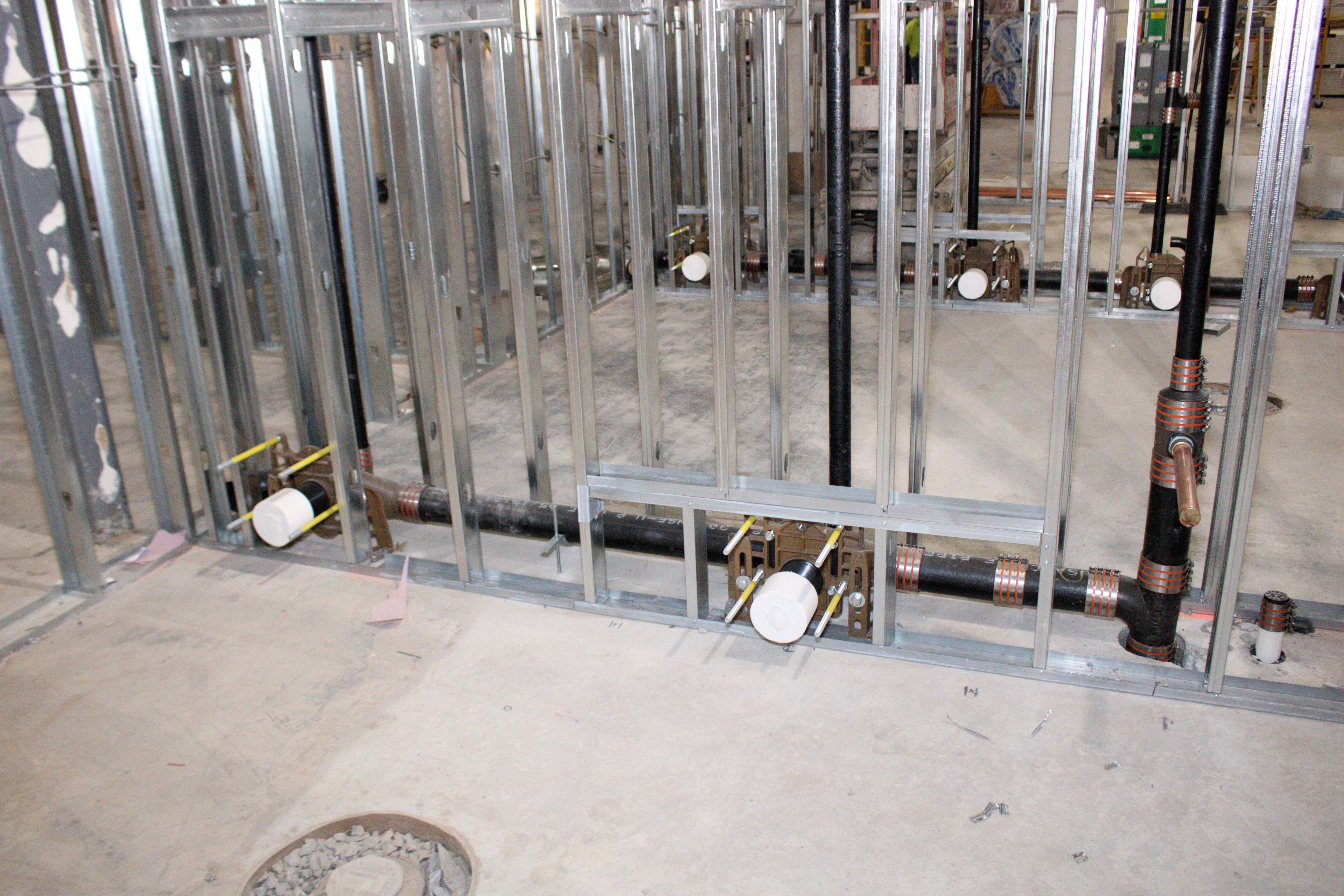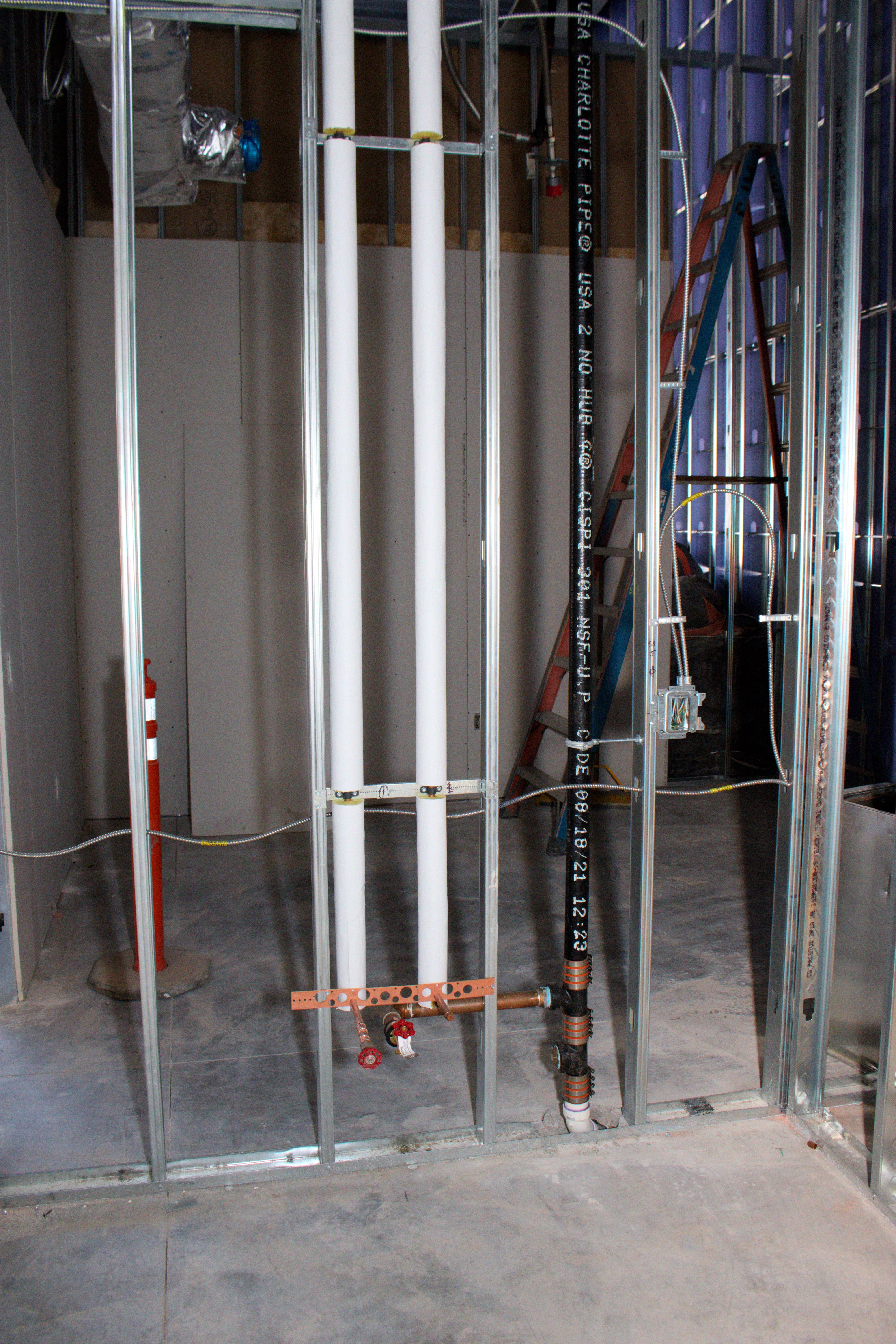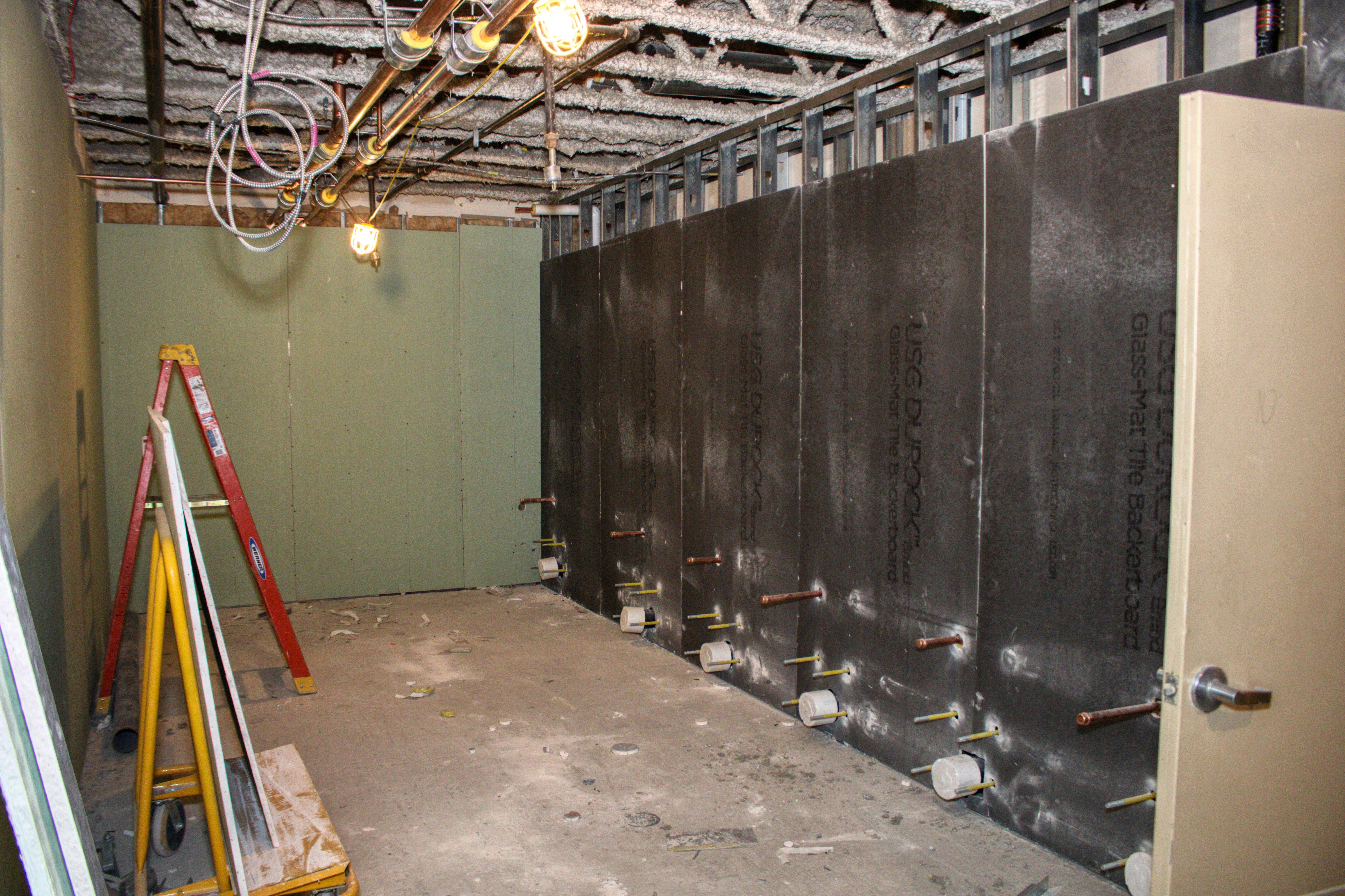 Plumbing: Now that the shower and bathroom/turn-out rooms and decontamination shower and laundry space have been framed, the plumbing rough has been in full force over the past 2 weeks and we will be looking forward for arrival of the new fixtures, sinks, toilets, etc. over the next month. The bathrooms have all been field measured for the partitions and will be installed once manufactured.
