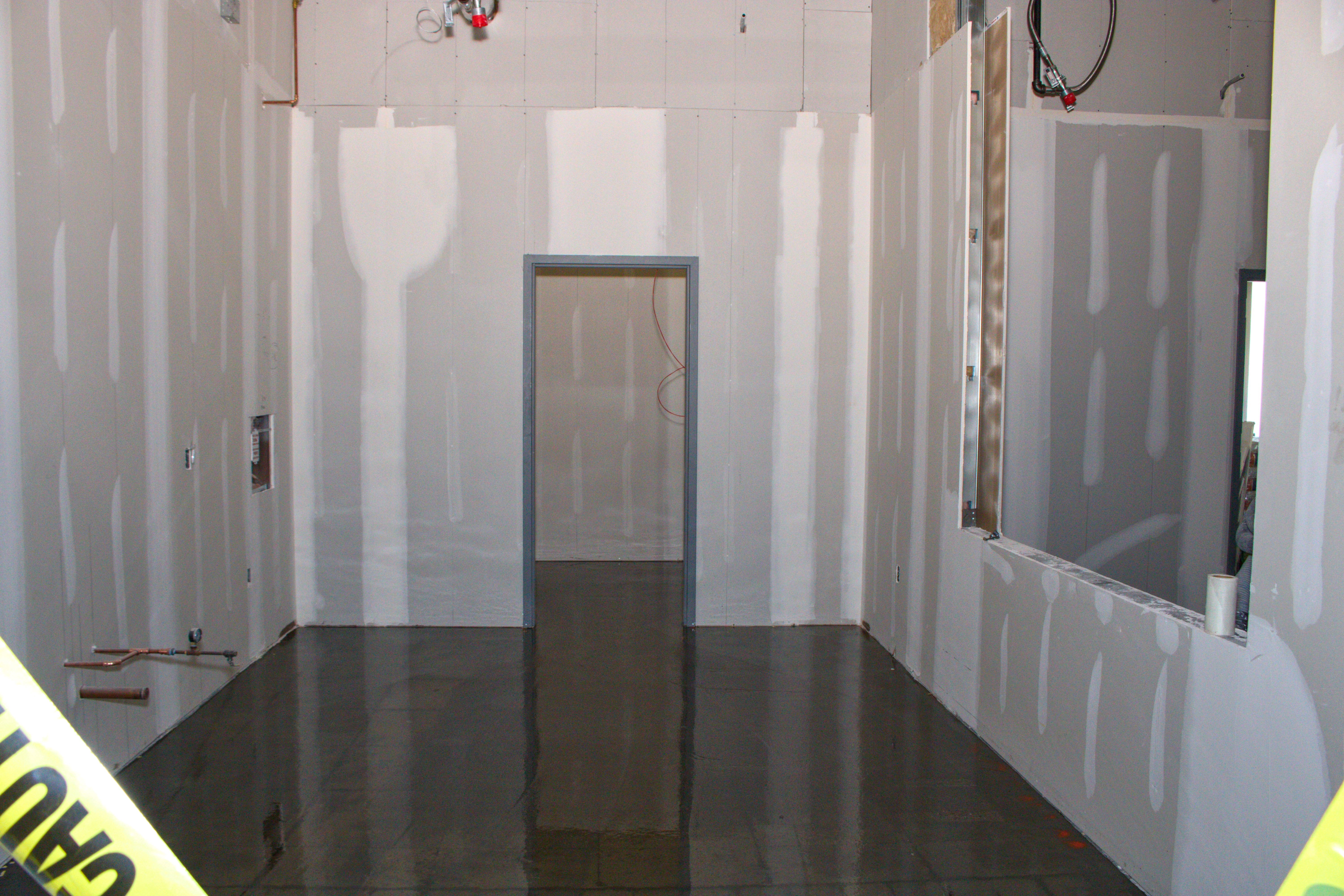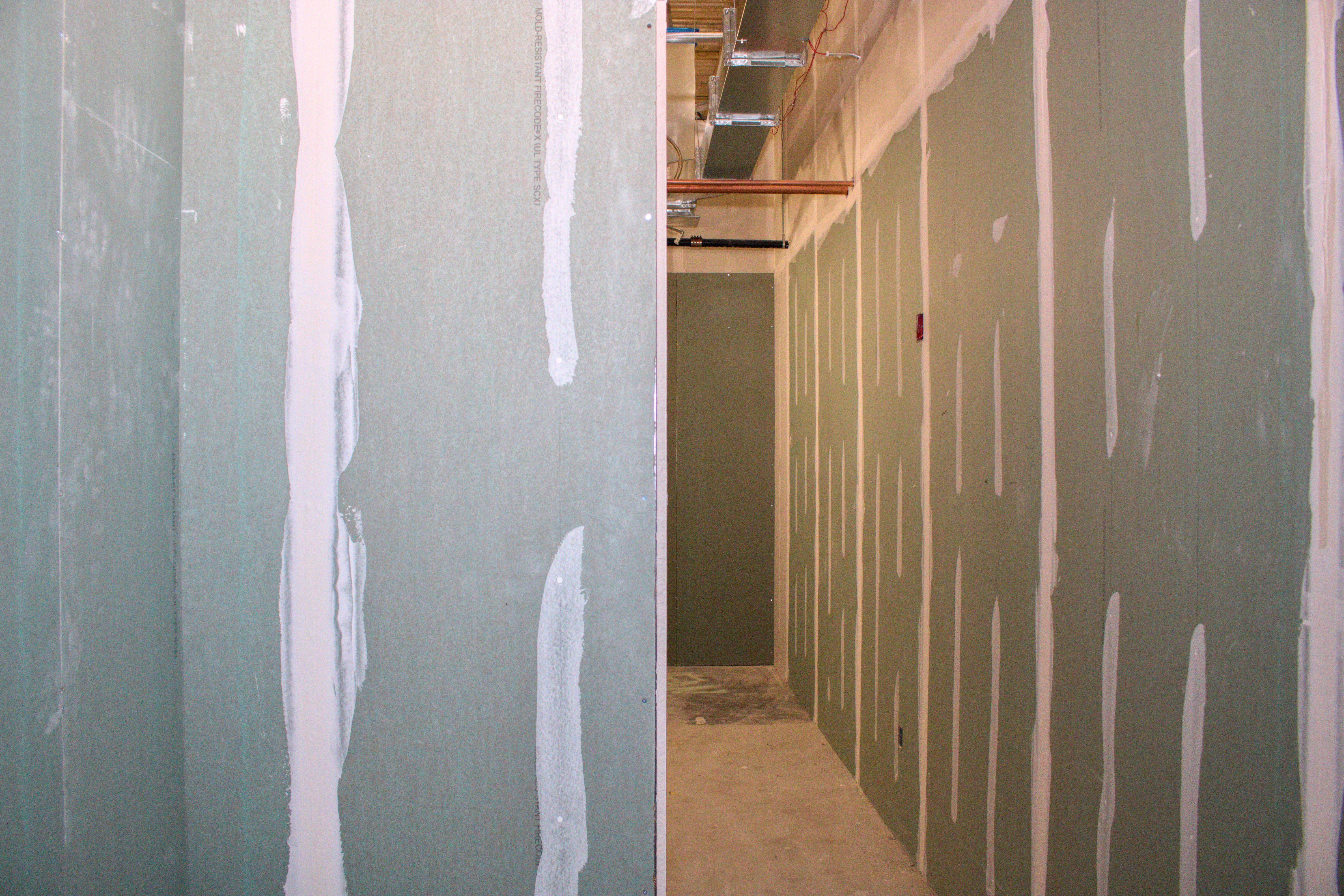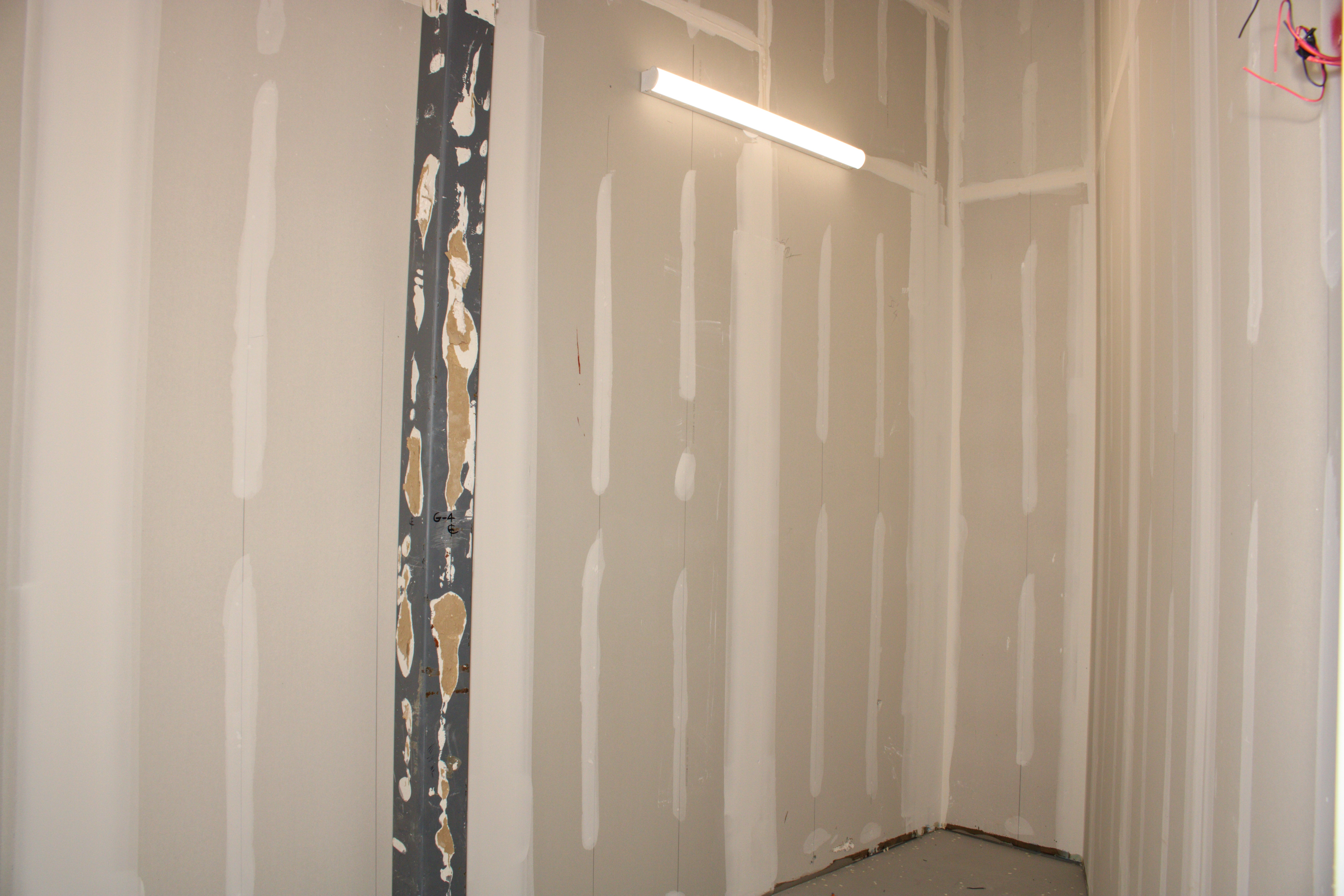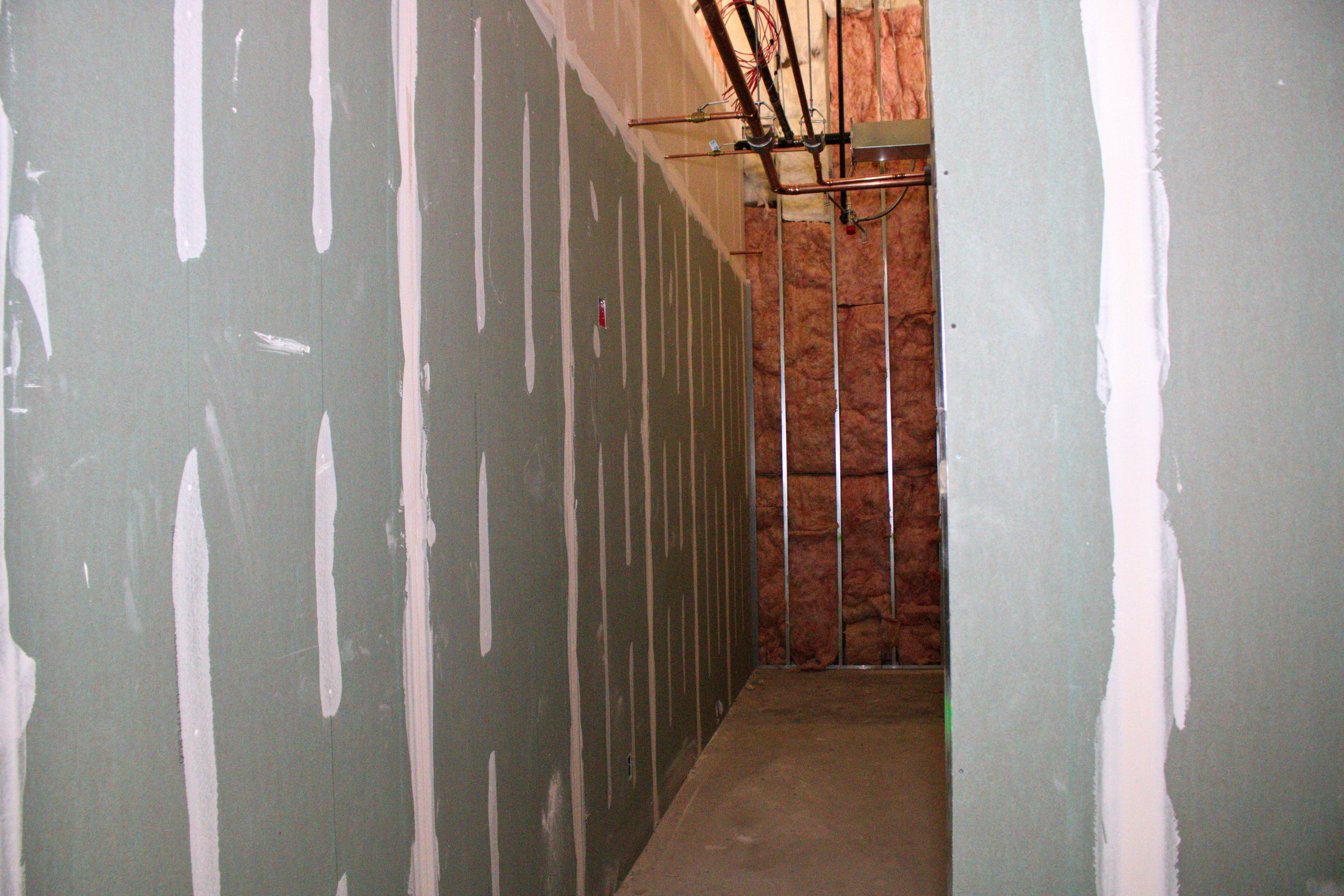 Drywall: 95 % of the interior walls South of A line have been framed, drywall panels have been installed and are being finish coated with tape and spackle now. Ready for paint.