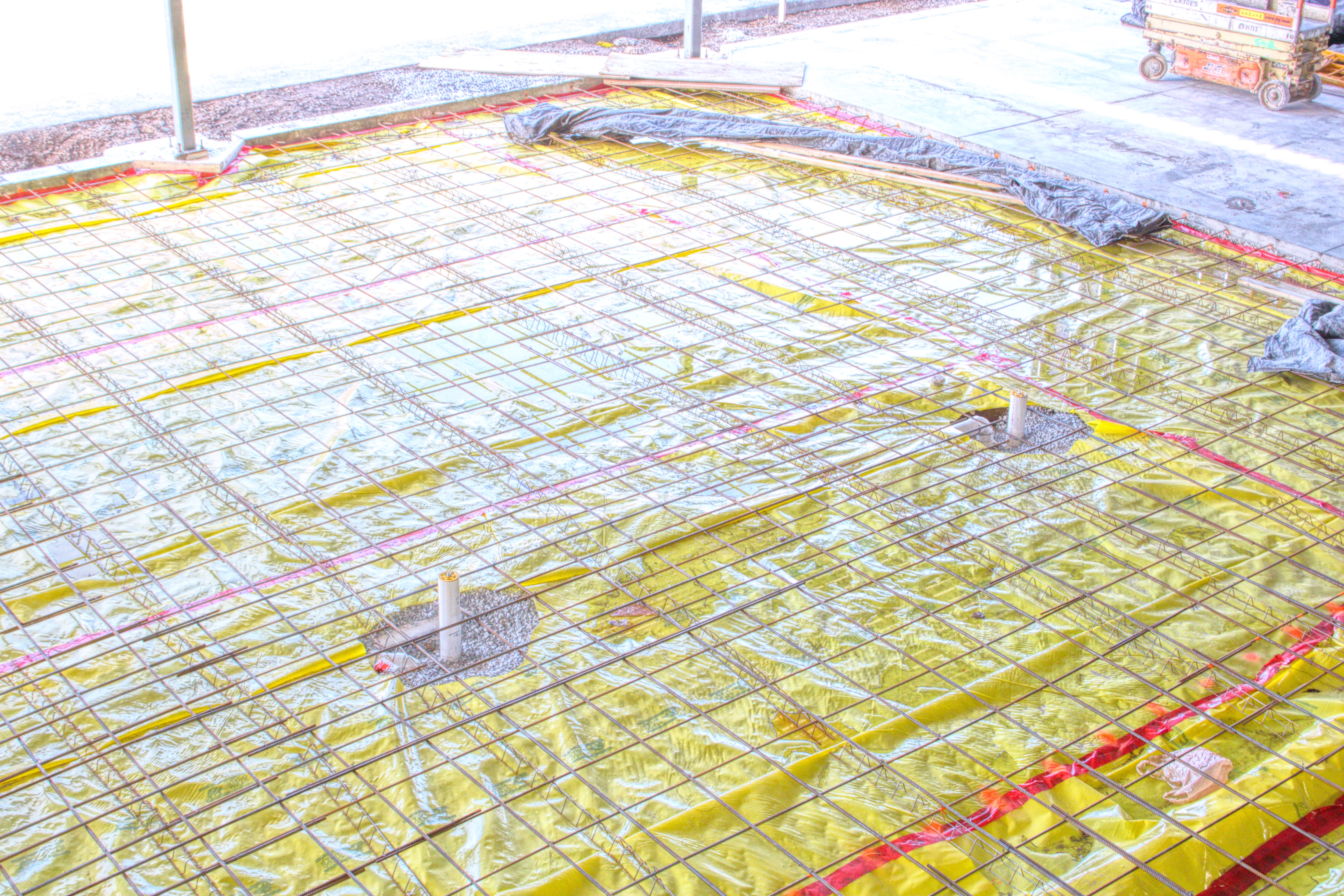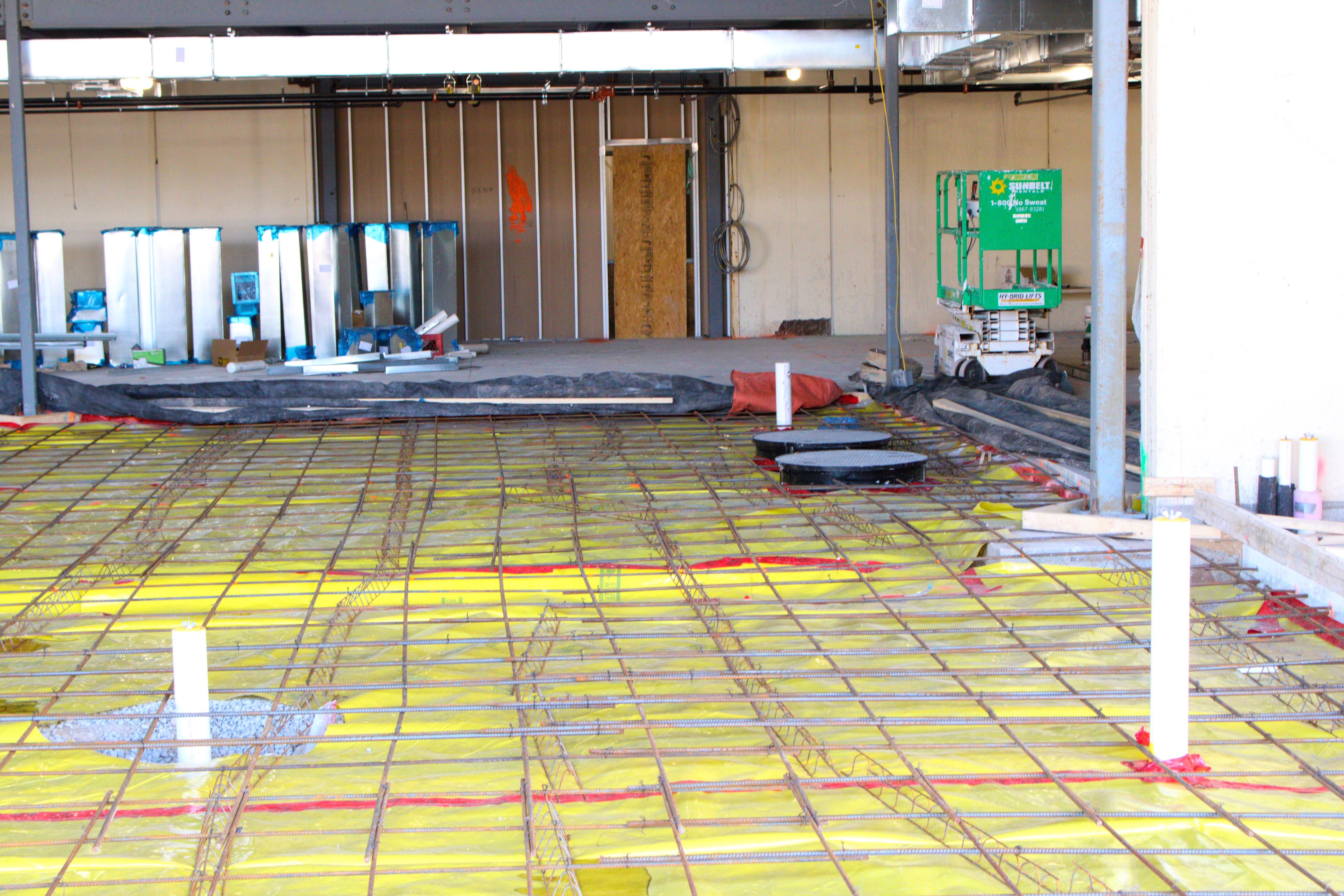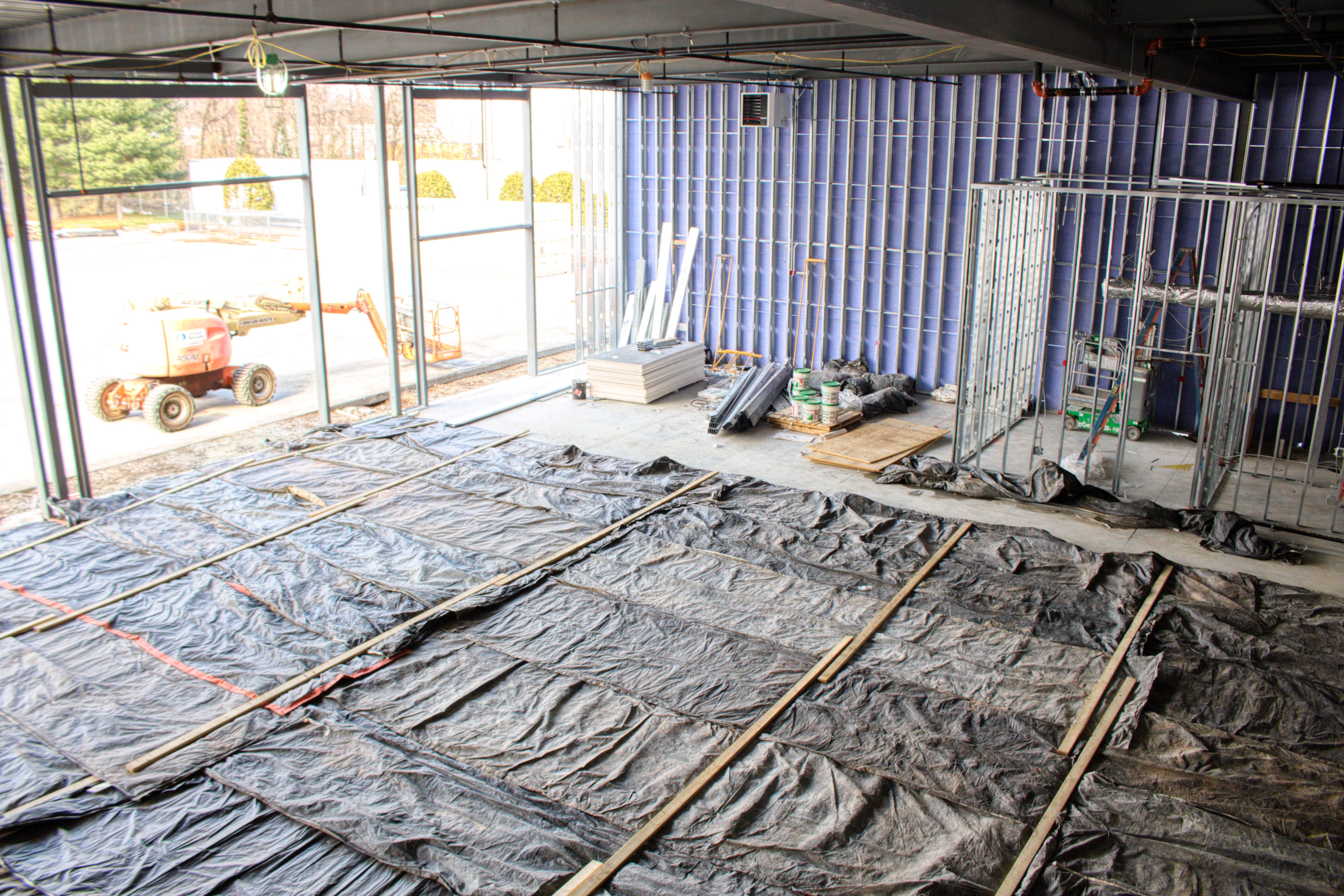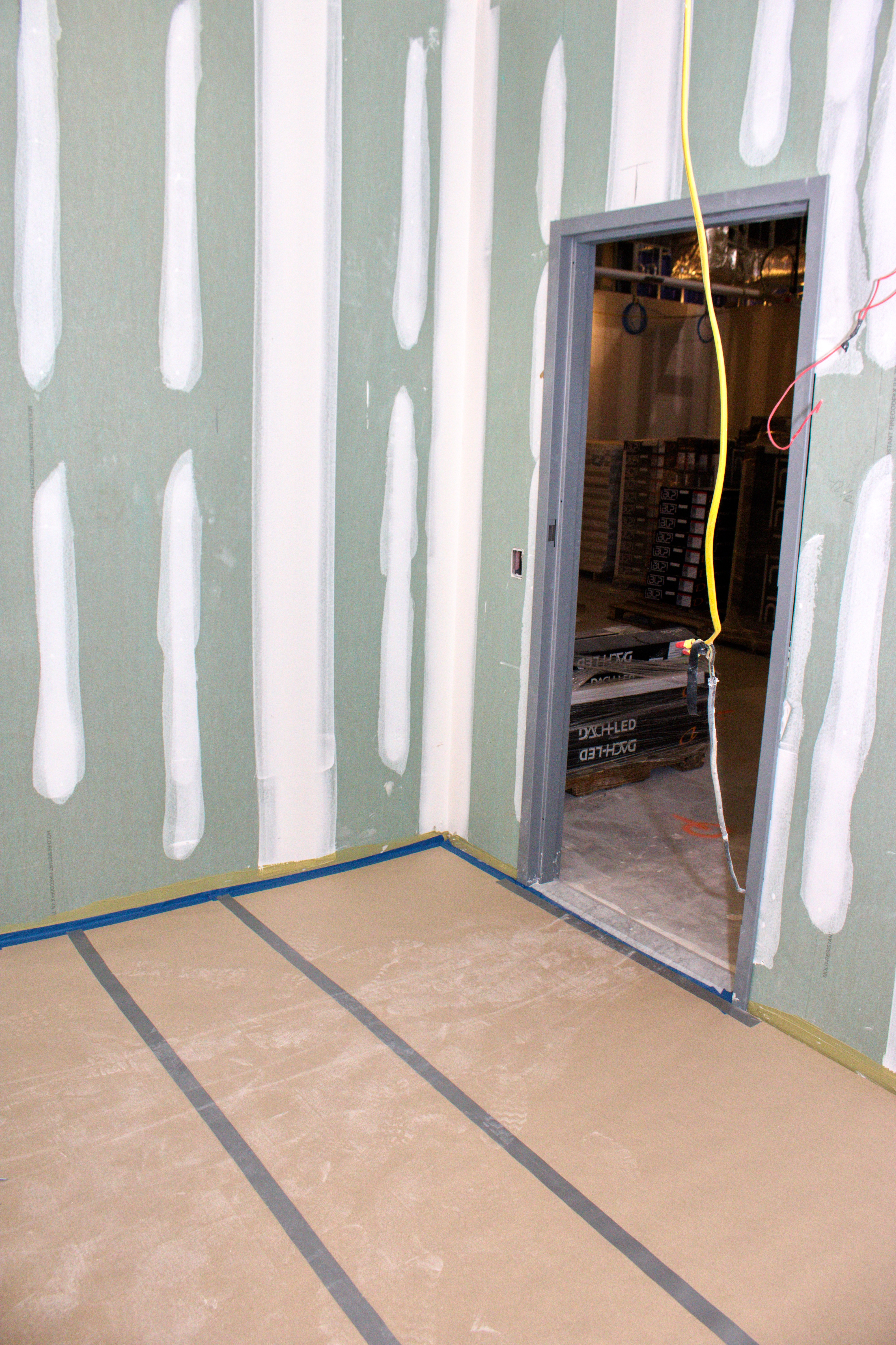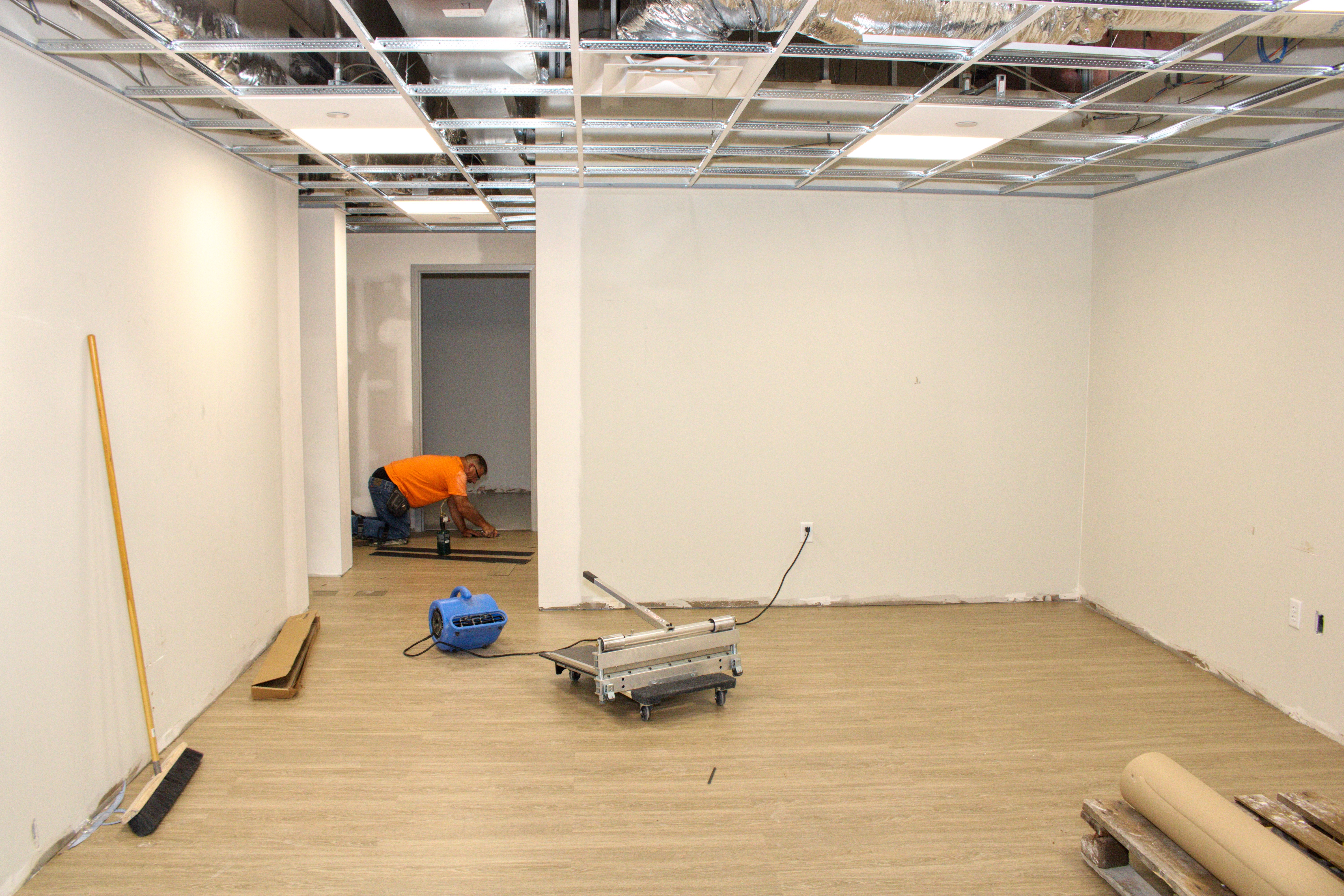 Flooring: The flooring contractor has been prepping the existing slab for finishes including installation of a vapor barrier which protects the eventual finished floor materials.
