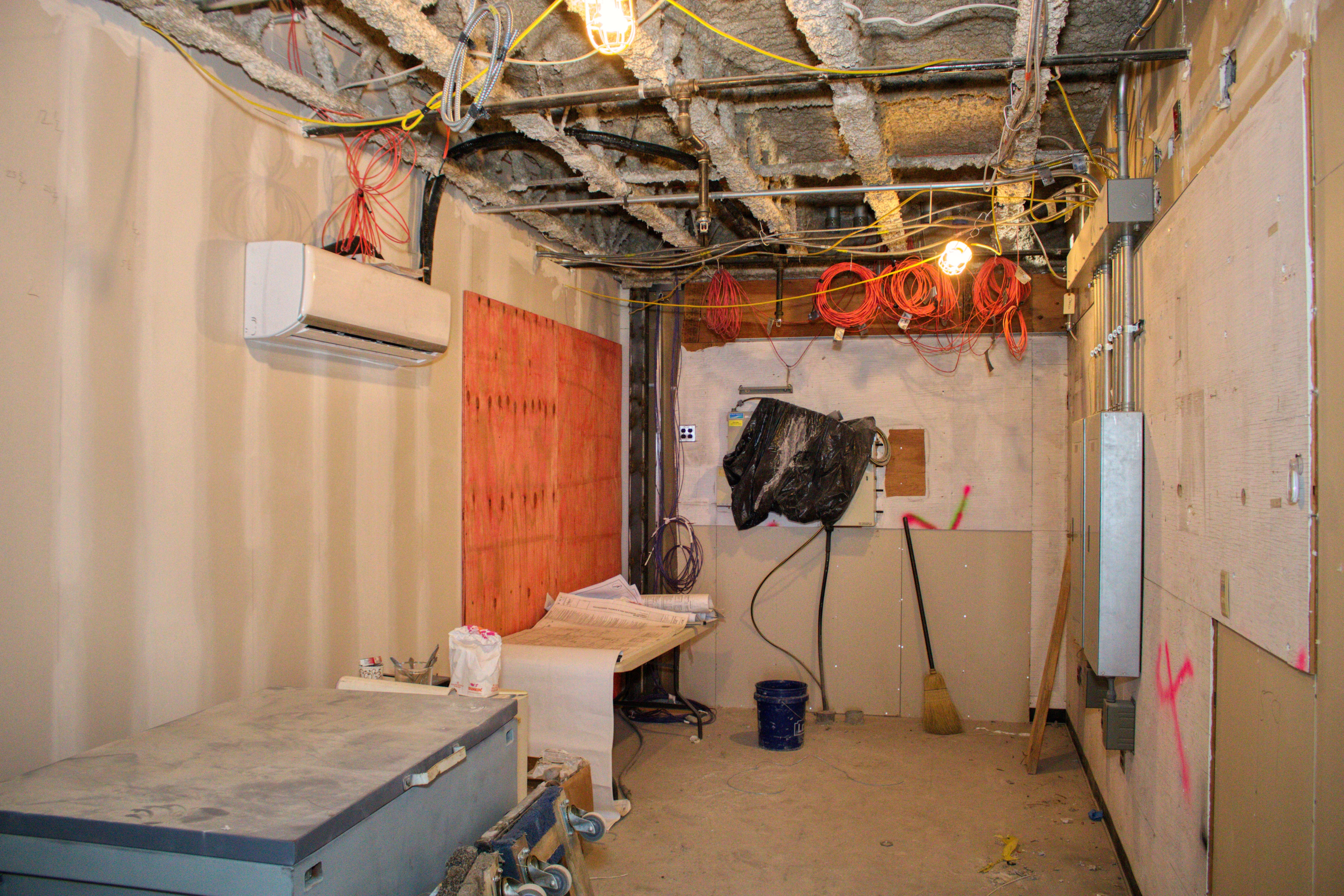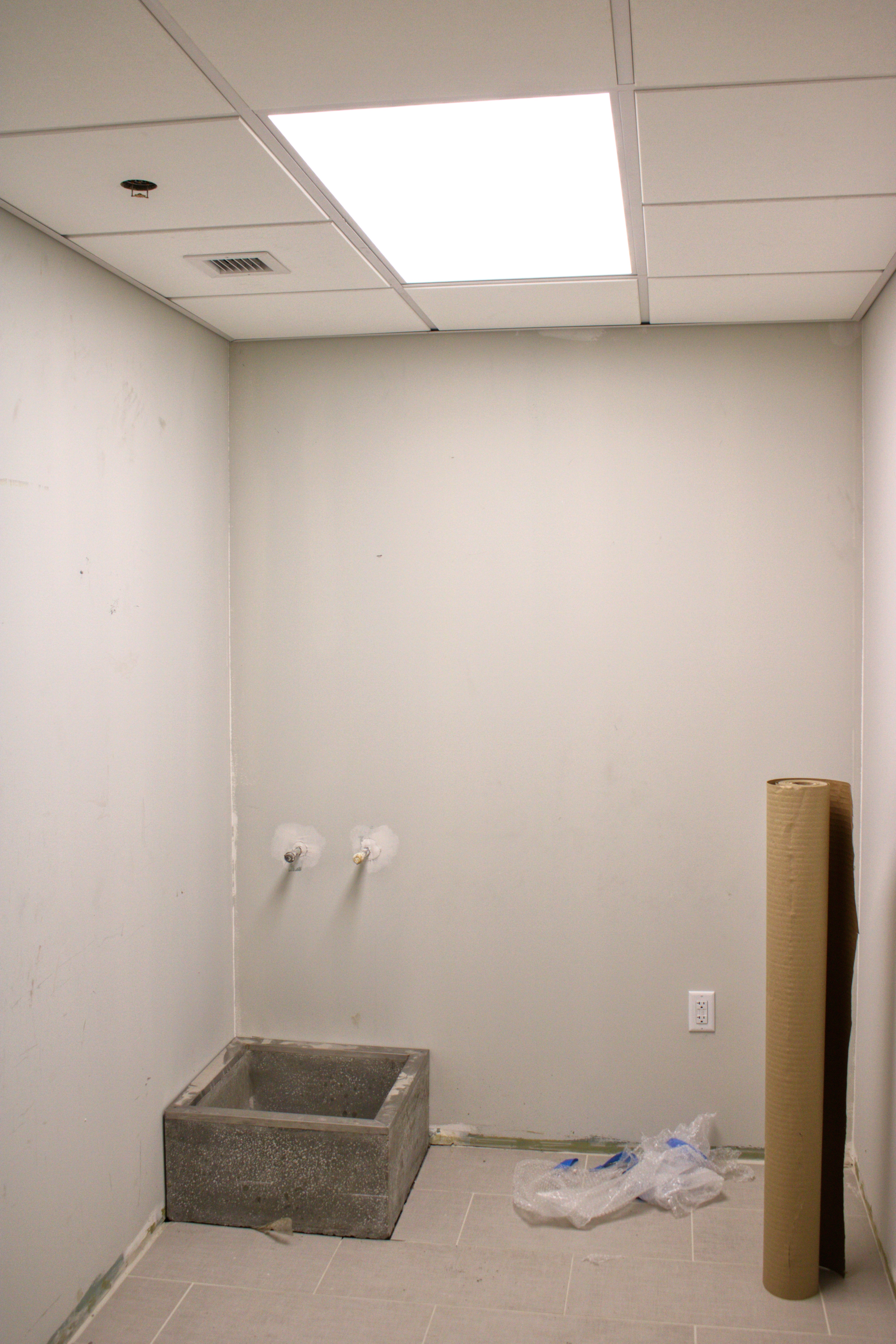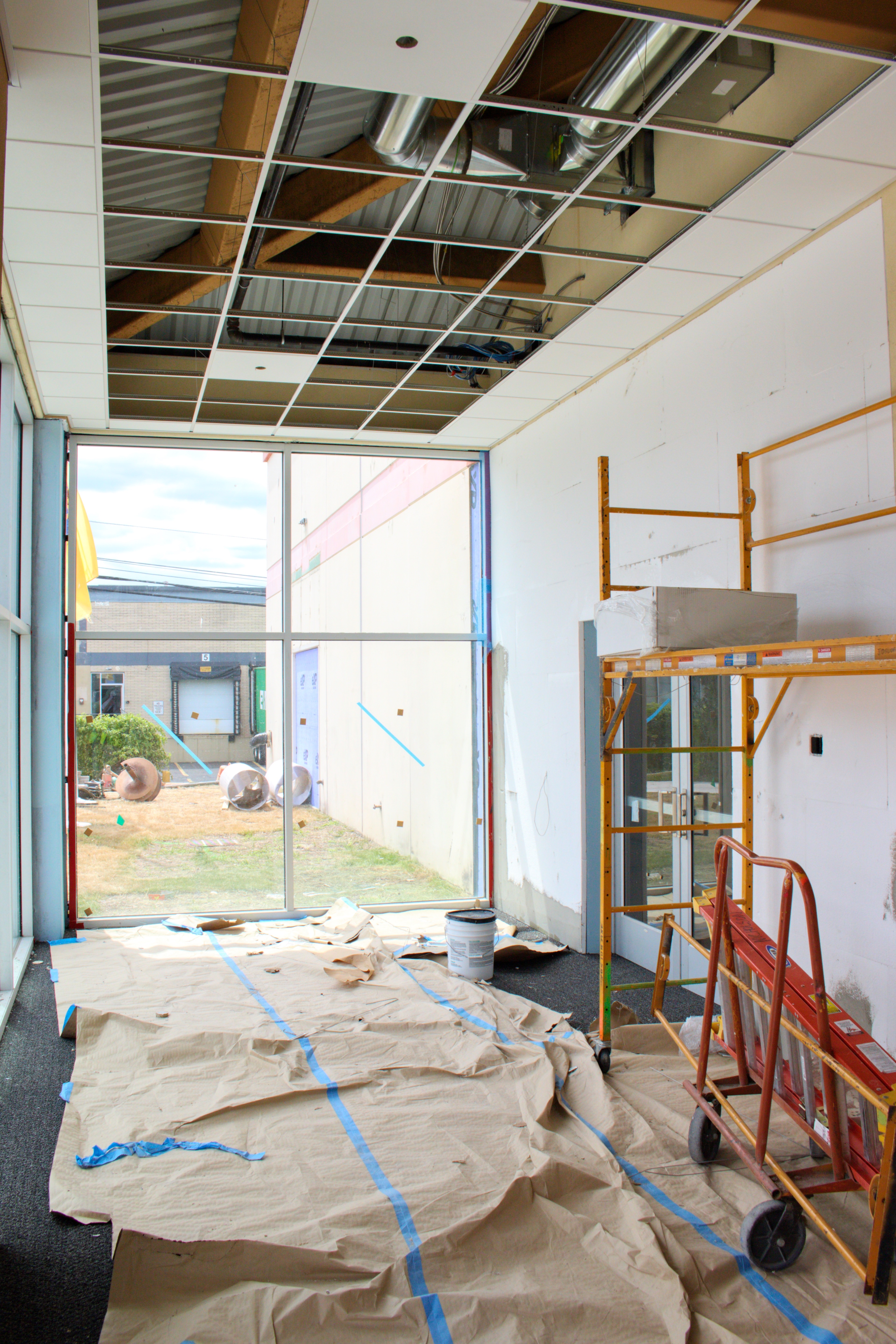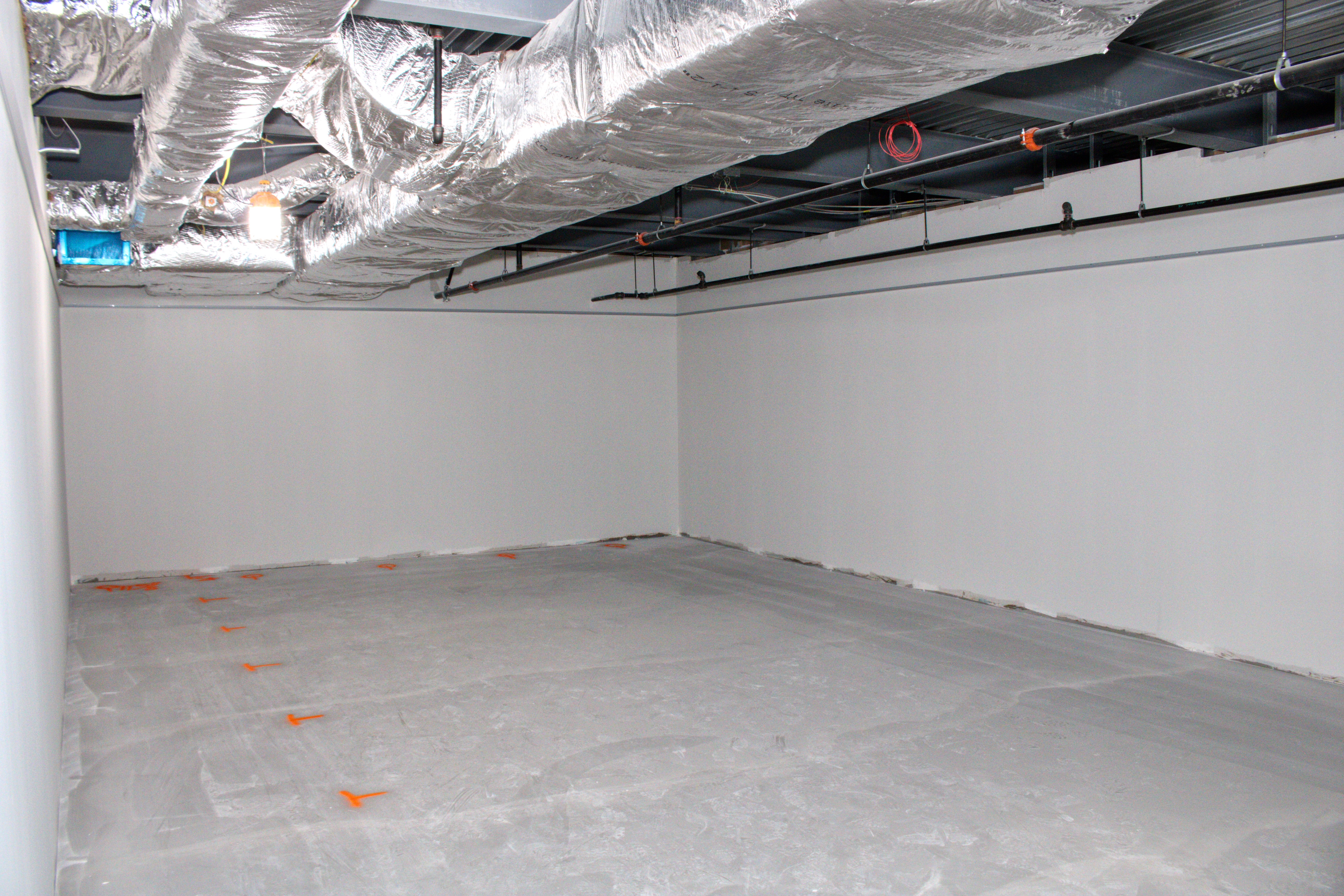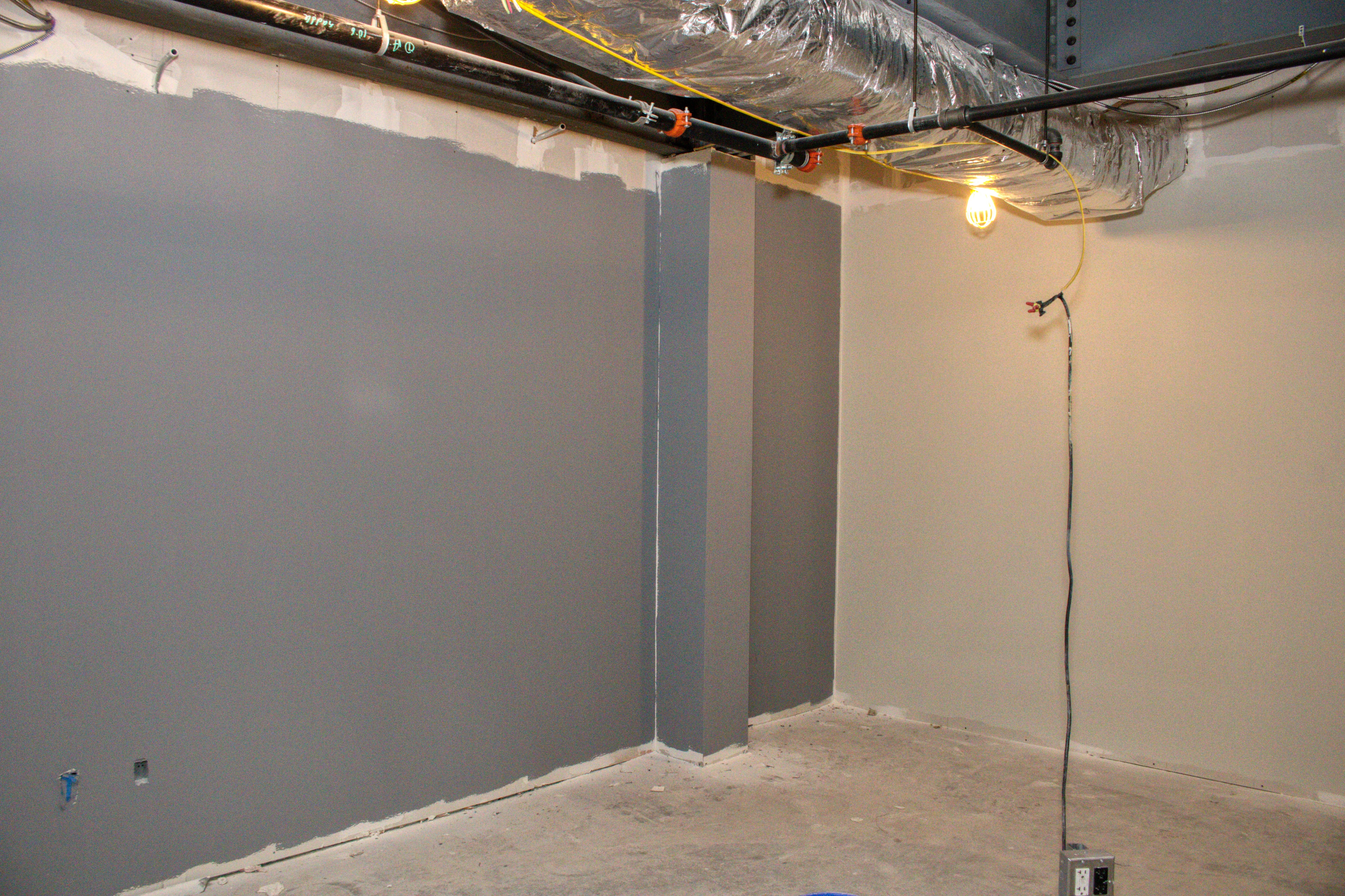 Flooring: The flooring contractor has been prepping the existing slab for finishes including installation of a vapor barrier which protects the eventual finished floor materials.