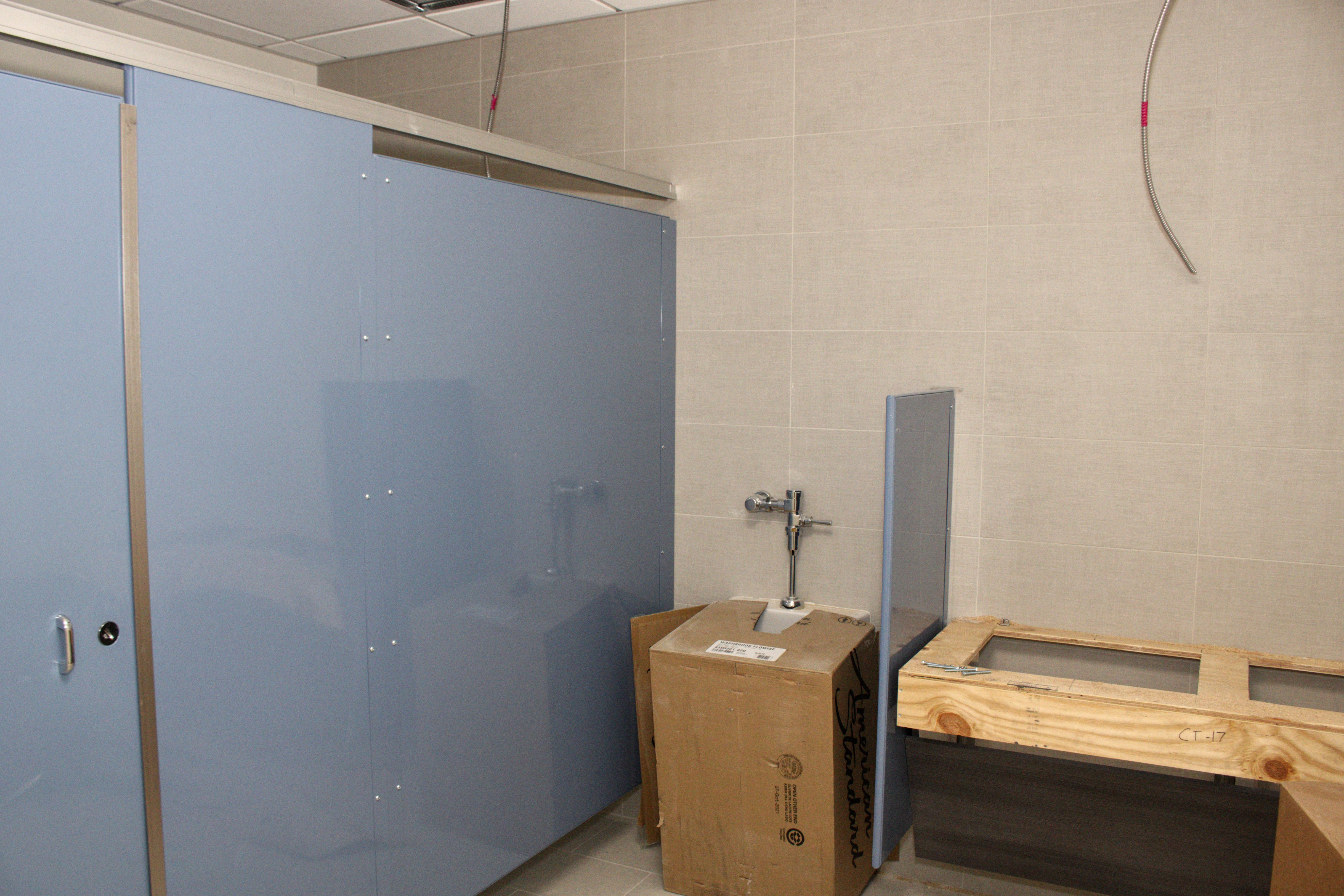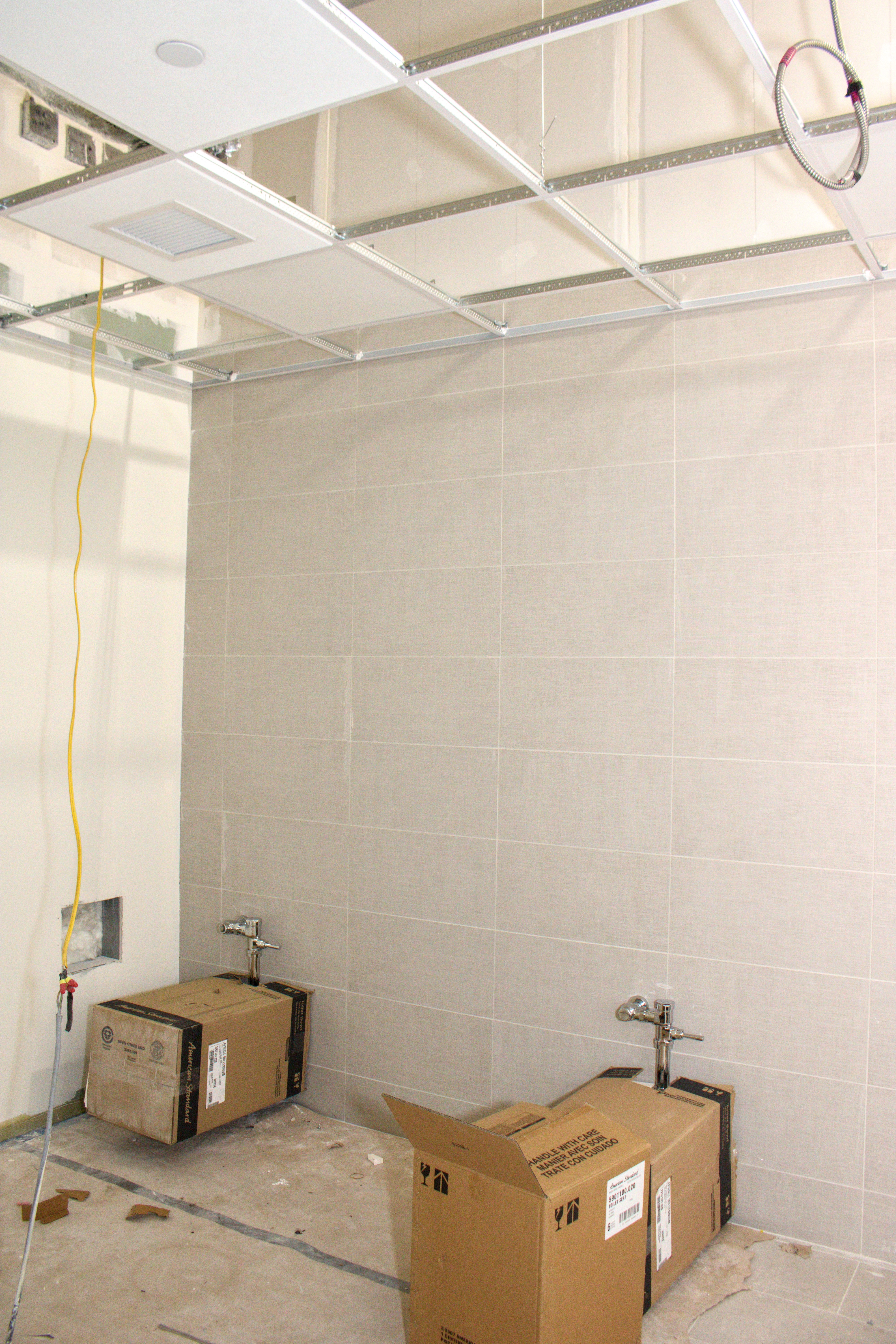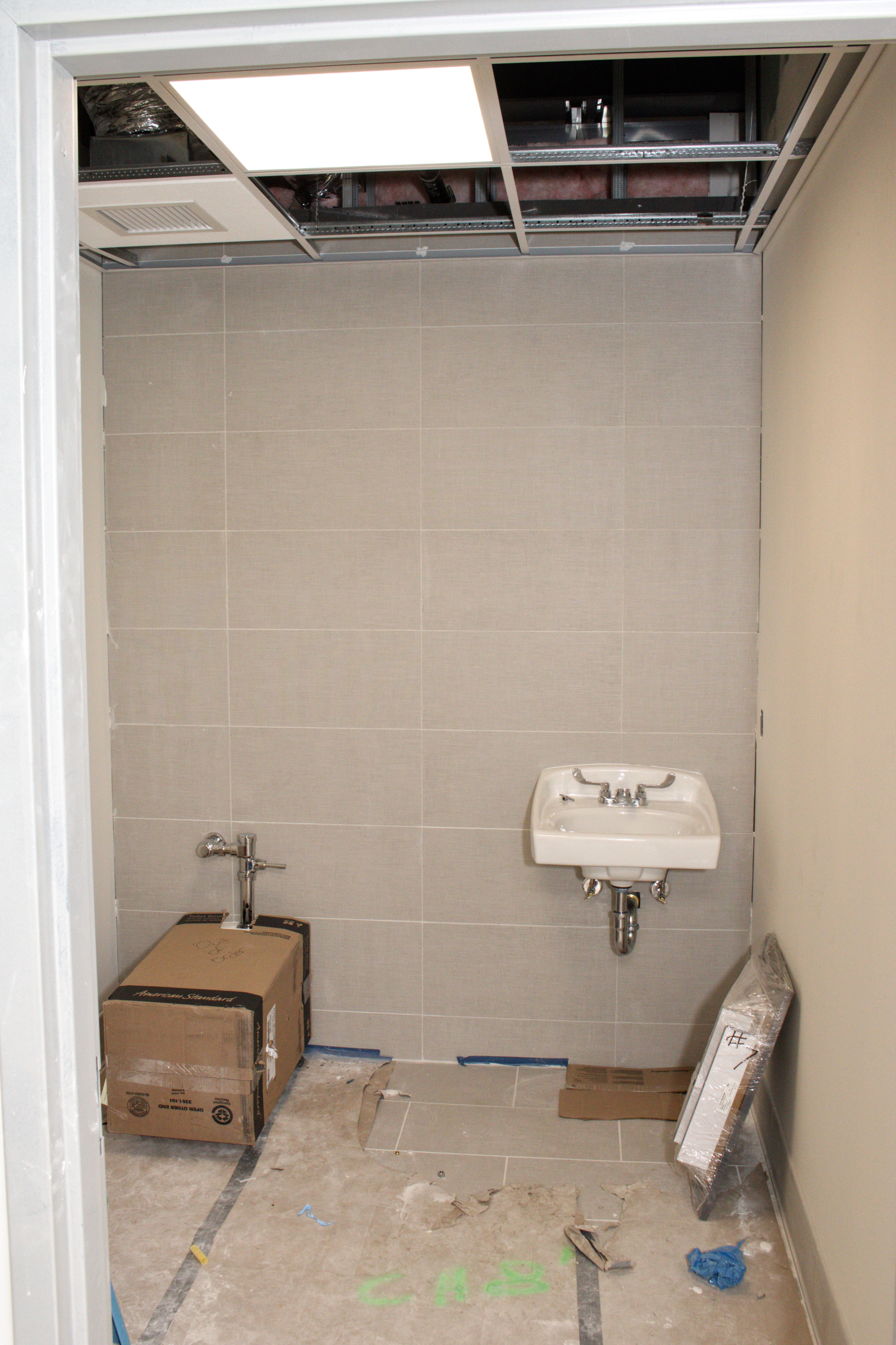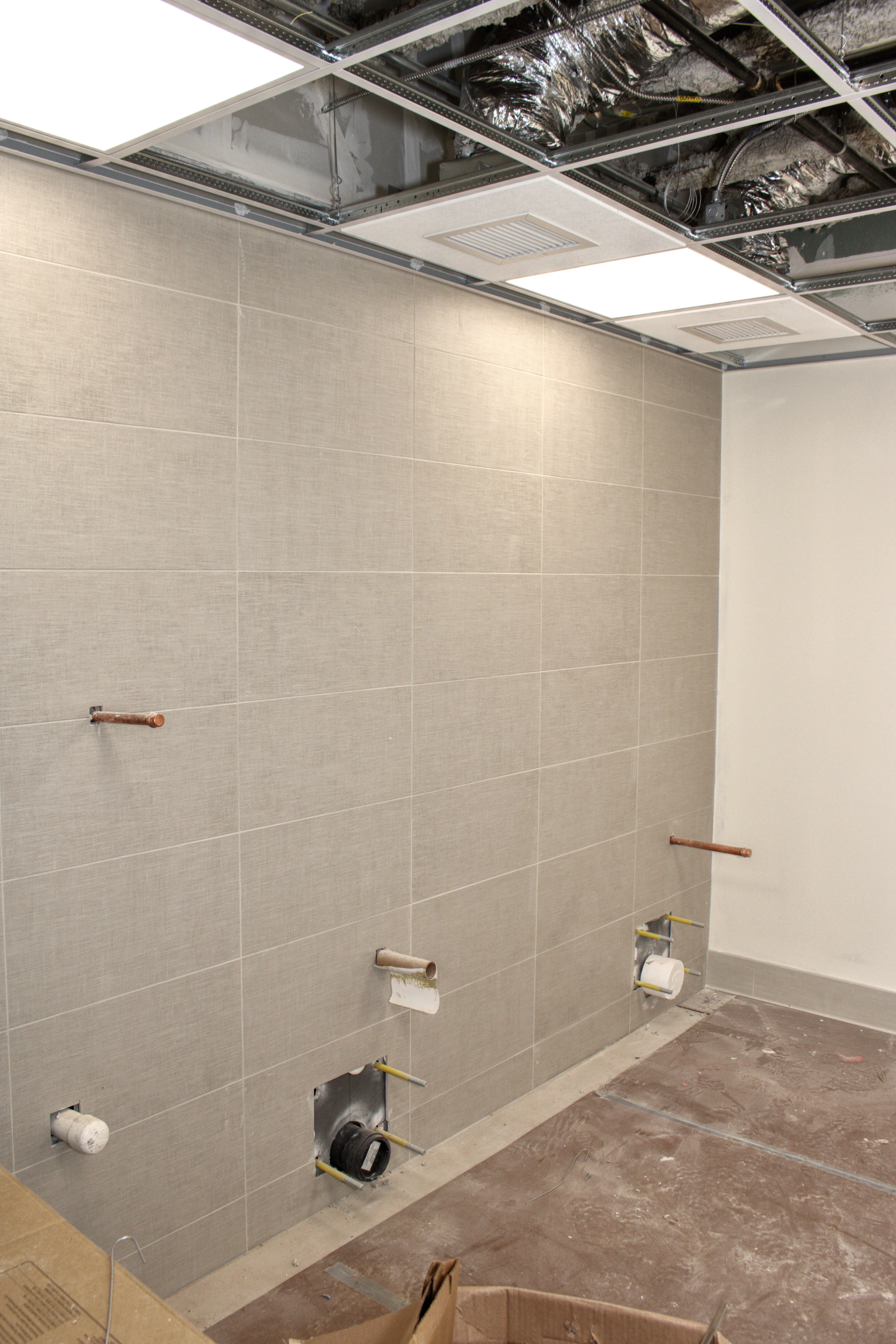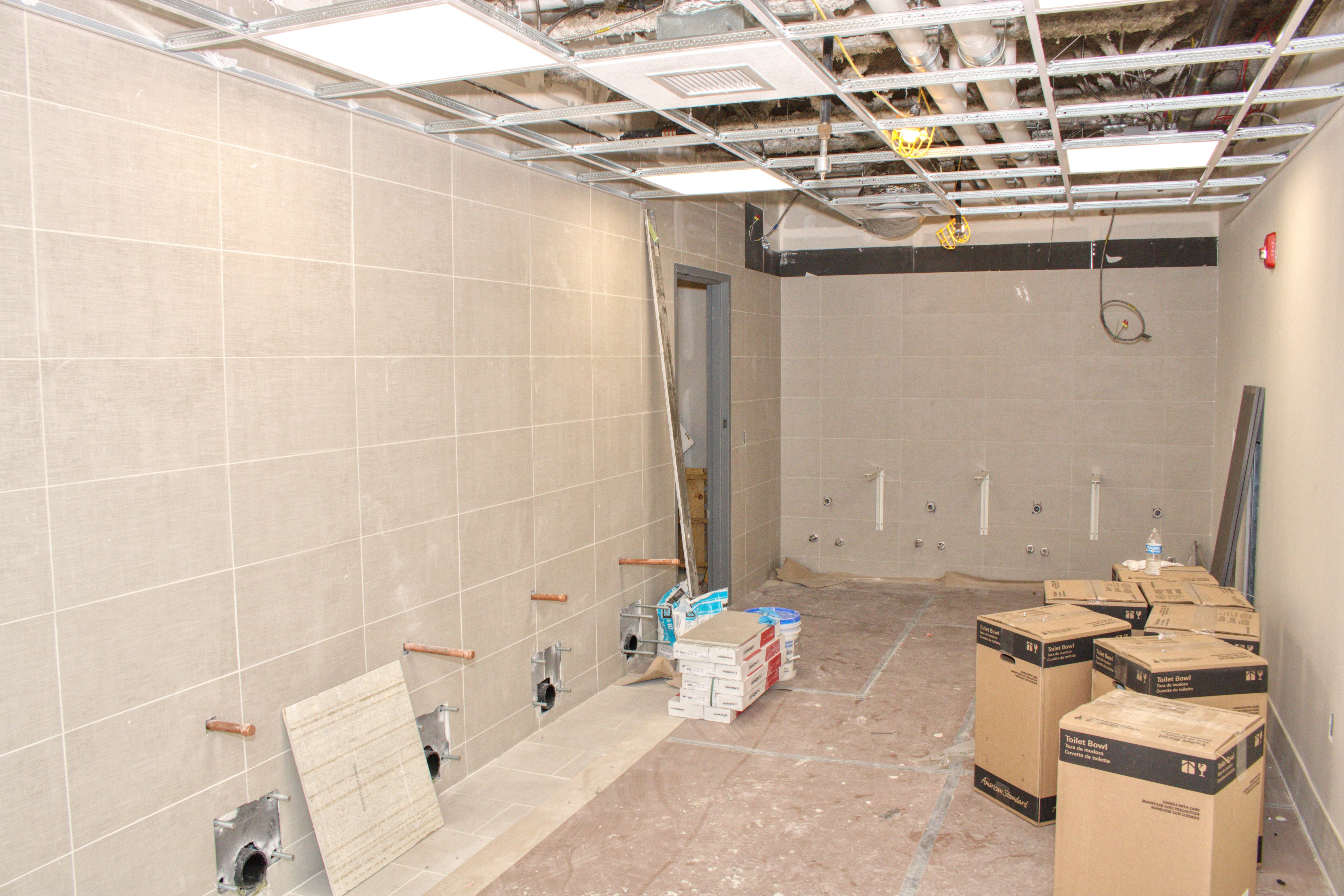 Flooring: The flooring contractor has completed all of the floor prep (outside of the gymnasium area) and vapor barrier for the eventual finishes, i.e. Carpet, VCT and LVT. Those finished floors will be installed more towards the last few weeks of the project to make sure they are not damaged. Ceramic tile at all of the bathrooms is 60% complete and will continue at the North end over the next few weeks.