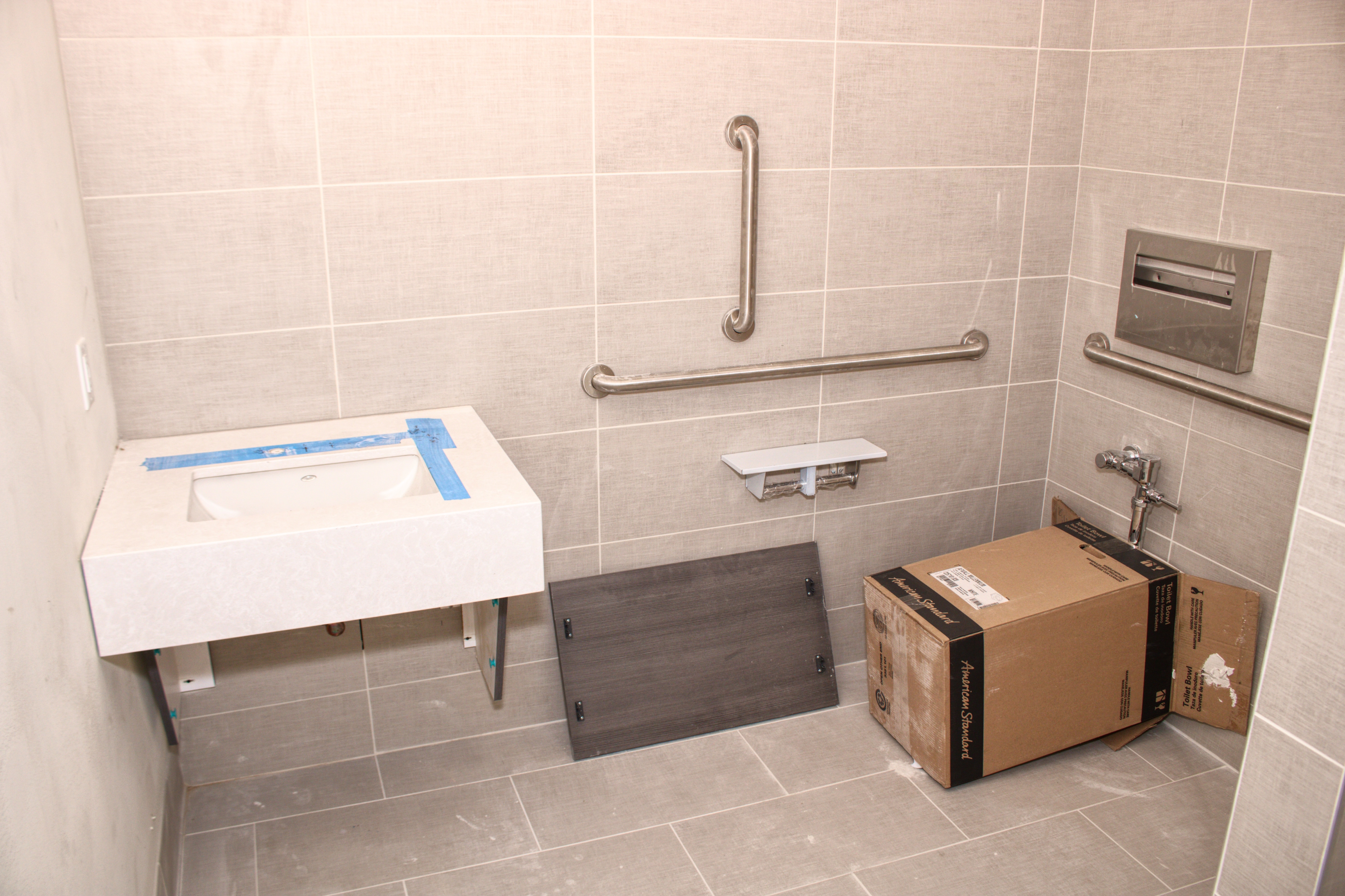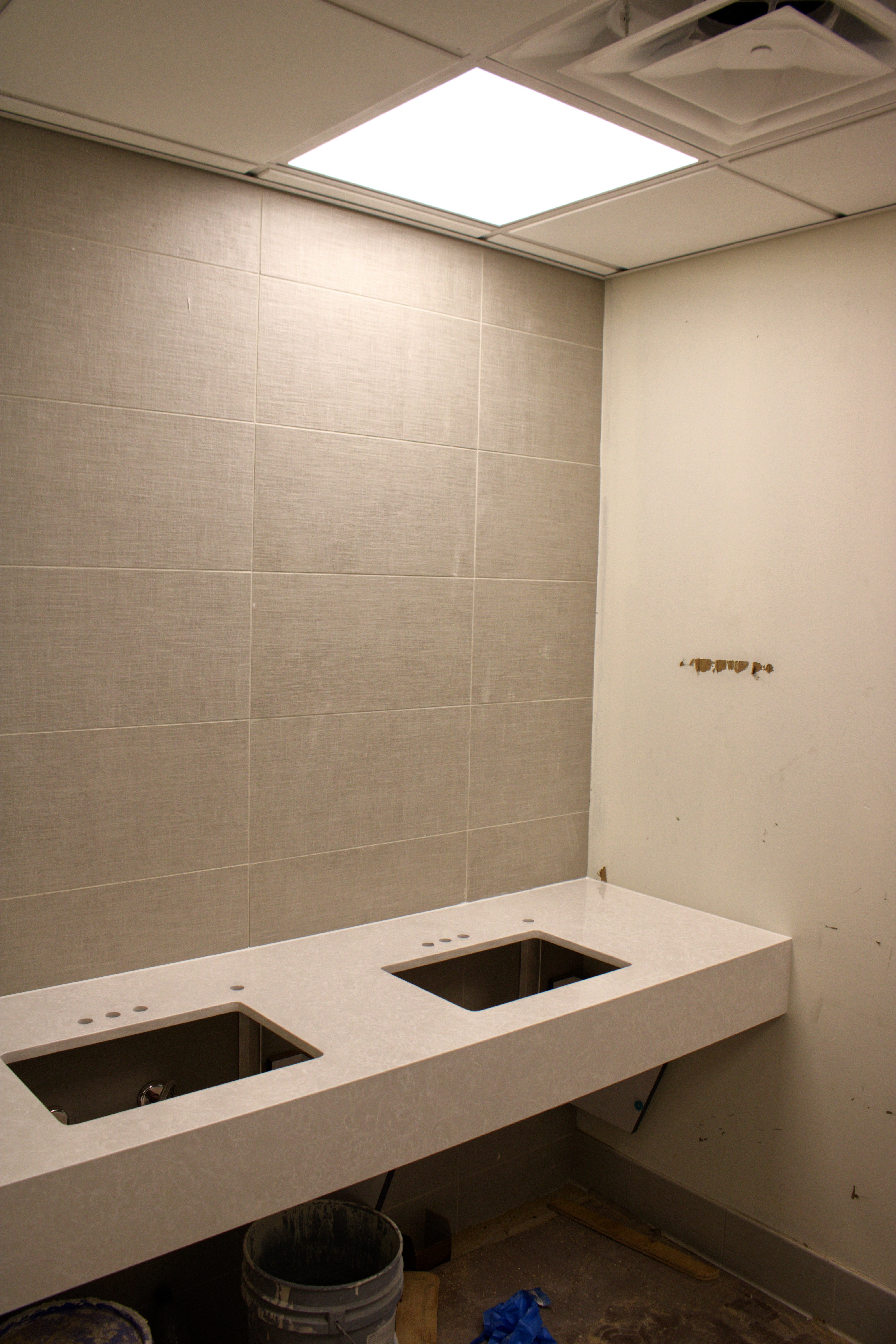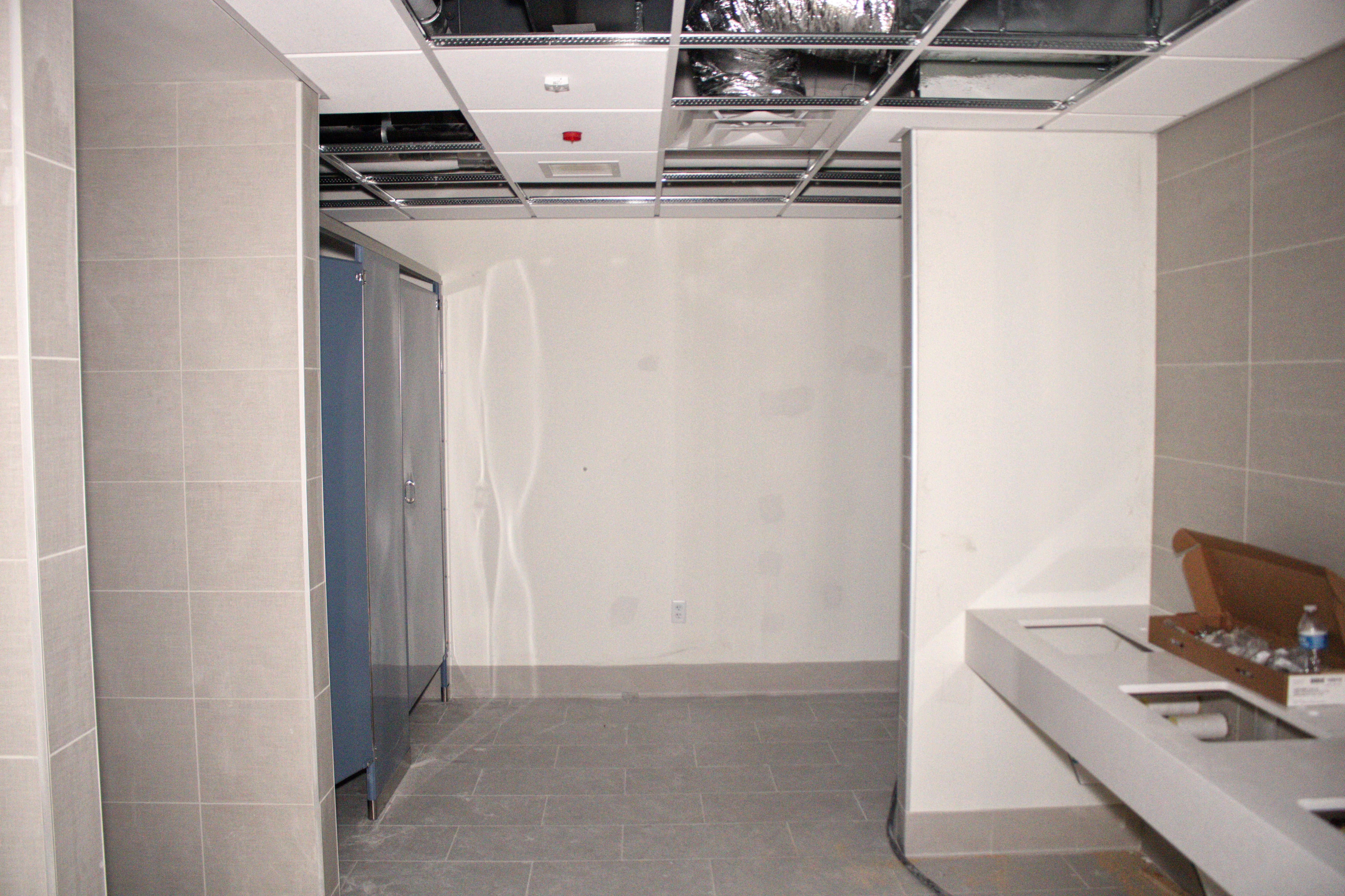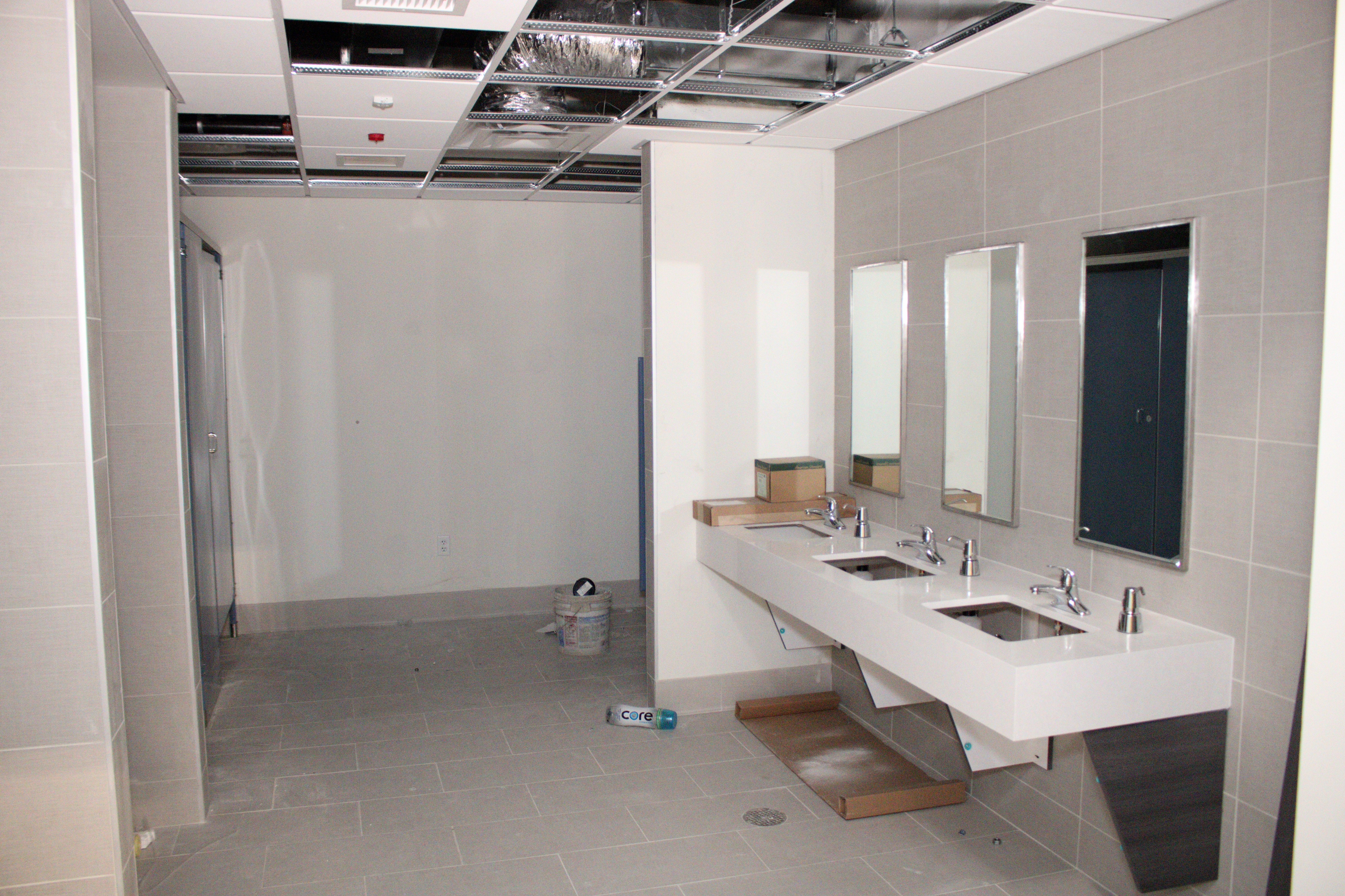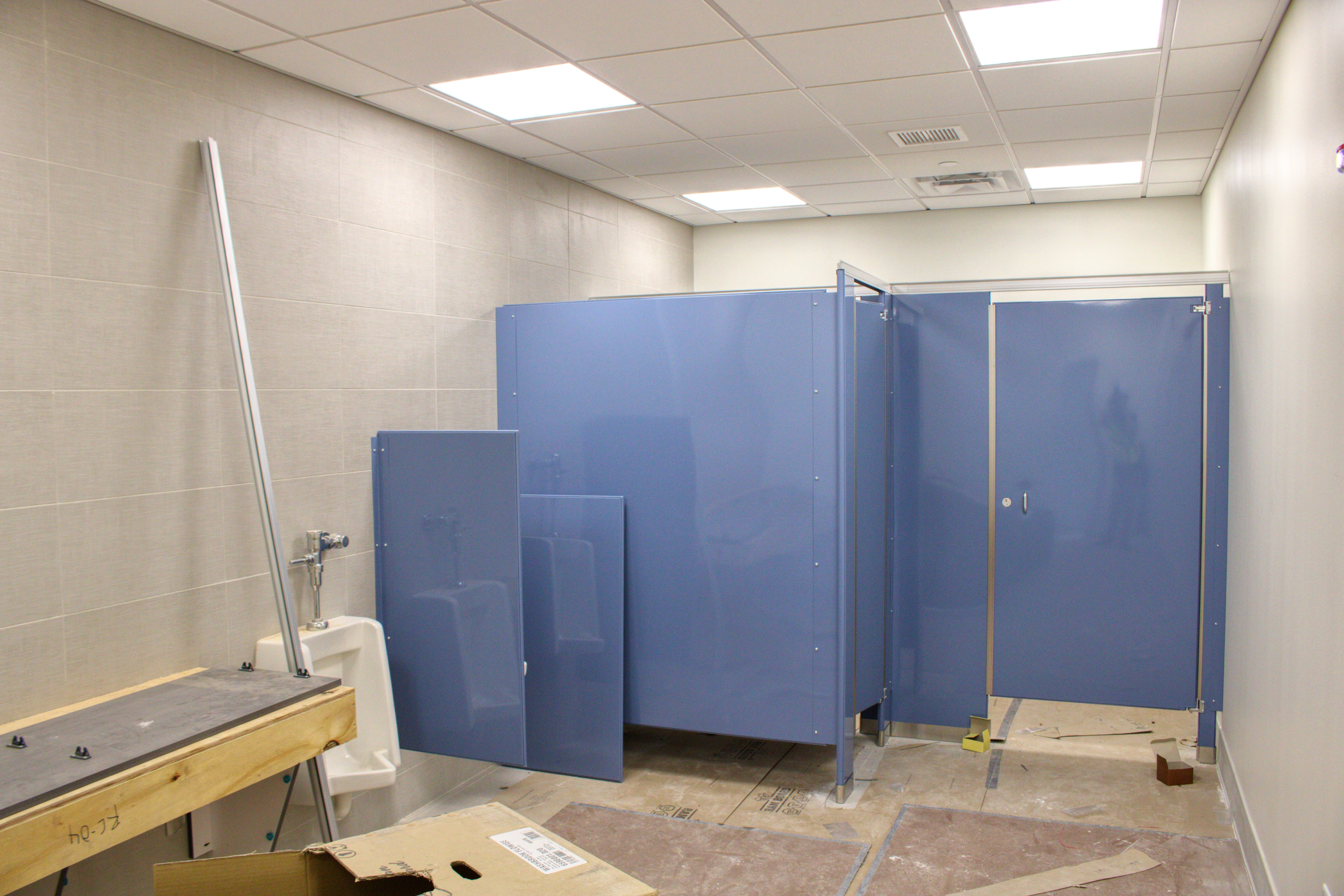 Flooring: The flooring contractor has completed all of the floor prep (outside of the gymnasium area) and vapor barrier for the eventual finishes, i.e. Carpet, VCT and LVT. Those finished floors will be installed more towards the last few weeks of the project to make sure they are not damaged. Ceramic tile at all of the bathrooms is 60% complete and will continue at the North end over the next few weeks.