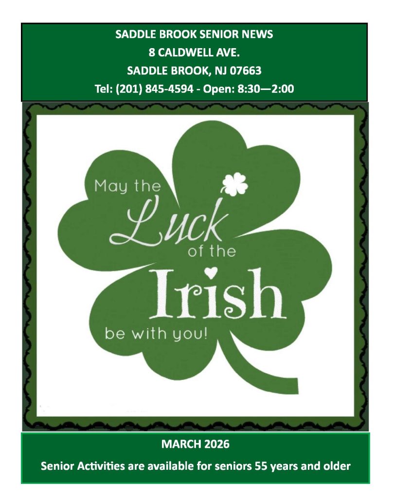 The Saddle Brook Senior Club meets on Tuesdays at 1:00 p.m. at the Senior Citizen Center, 8 Caldwell Avenue, Saddle Brook.